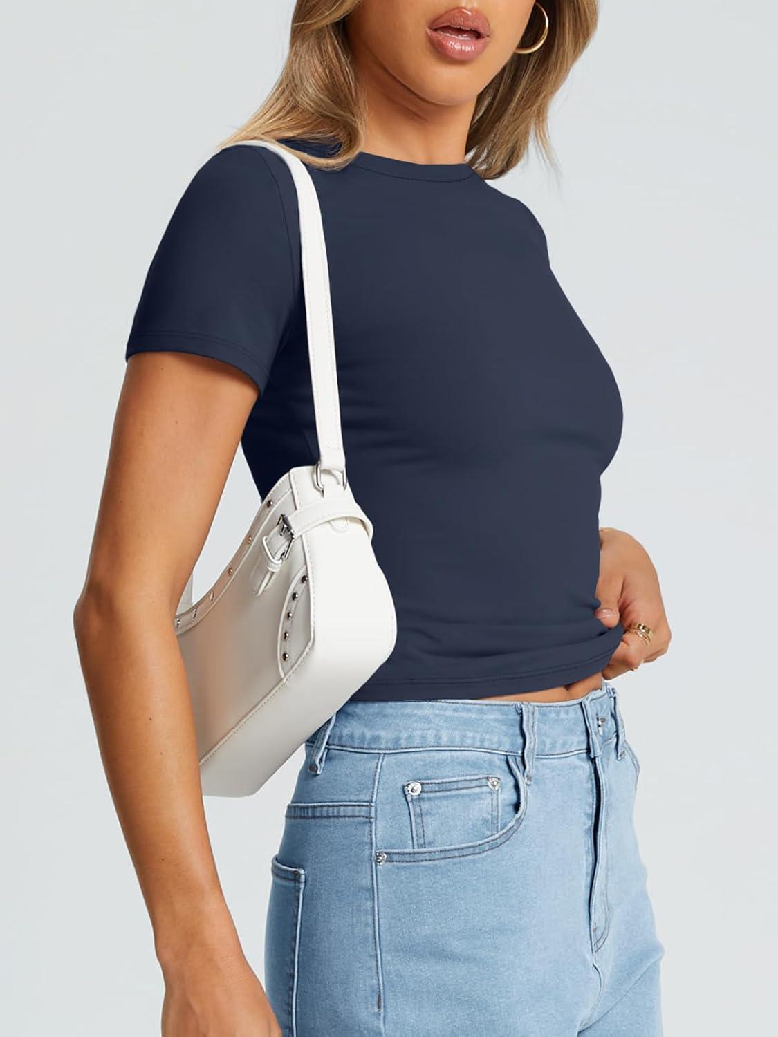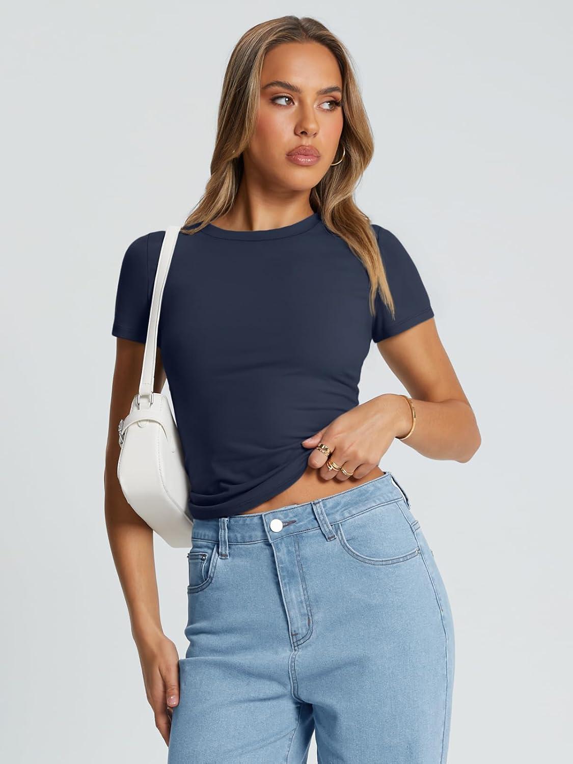 Trendy Queen Womens Basic T Shirts Summer Tops 2026 Crop Short Sleeve Slim Fit Tee Cute Gym Workout Clothes(Navy)