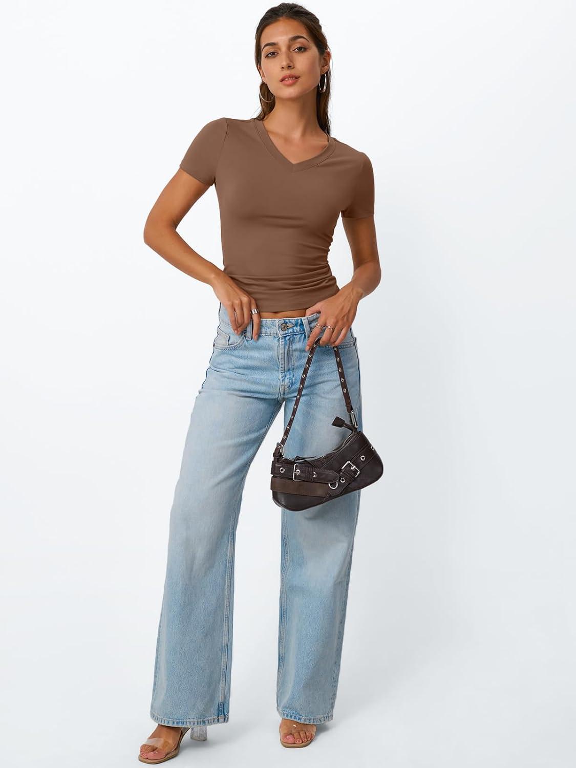 Trendy Queen Womens Basic V Neck Short Sleeve T Shirts Slim Fit Crop Y2k Tee 2025 Summer Cute Gym Fashion Clothes(Coffee)