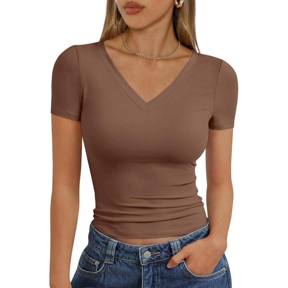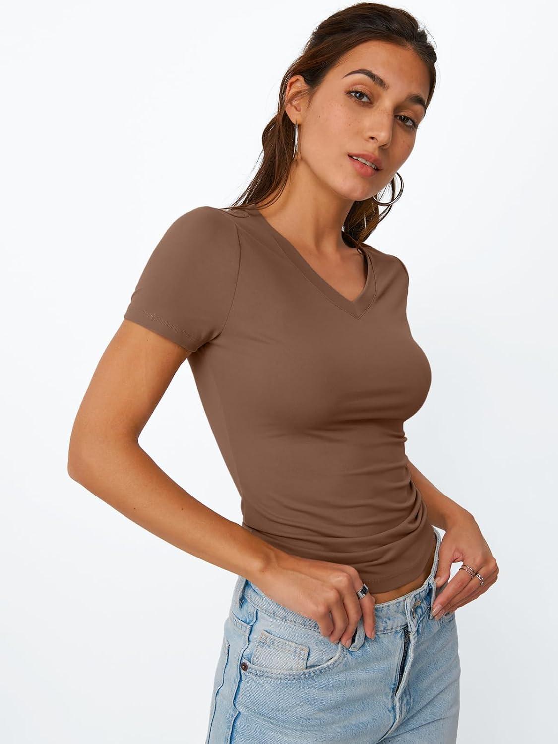 Trendy Queen Womens Basic V Neck Short Sleeve T Shirts Slim Fit Crop Y2k Tee 2025 Summer Cute Gym Fashion Clothes(Nutmeg)