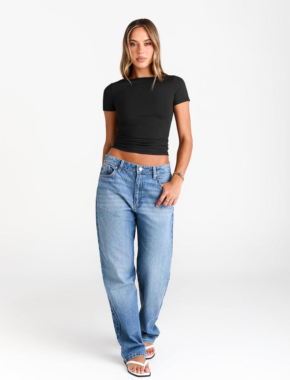 Trendy Queen Womens Boat Neck Short Sleeve T-Shirts Fitted Compression Summer Y2k Basic Tops 2026 Spring Outfits Clothes(Black)
