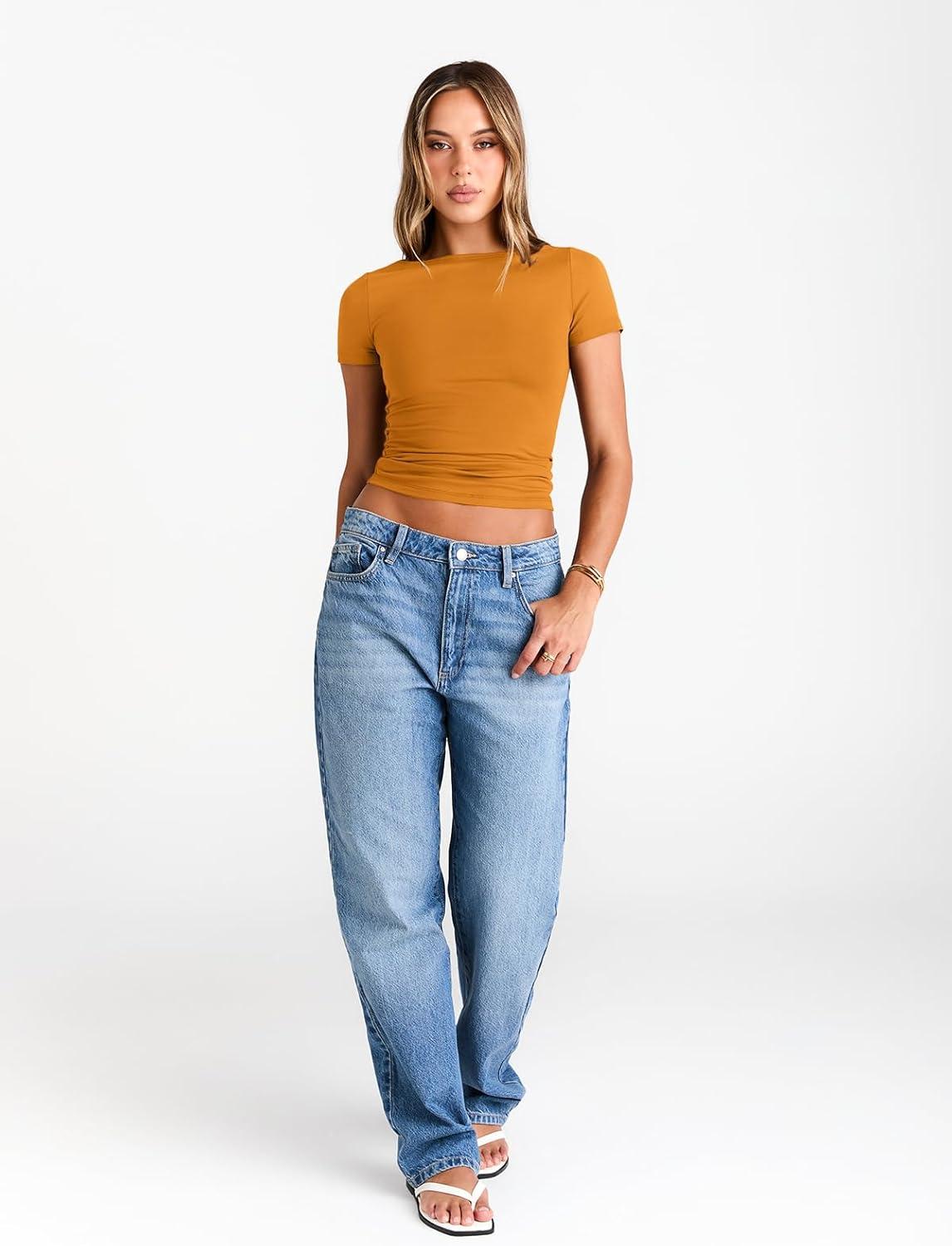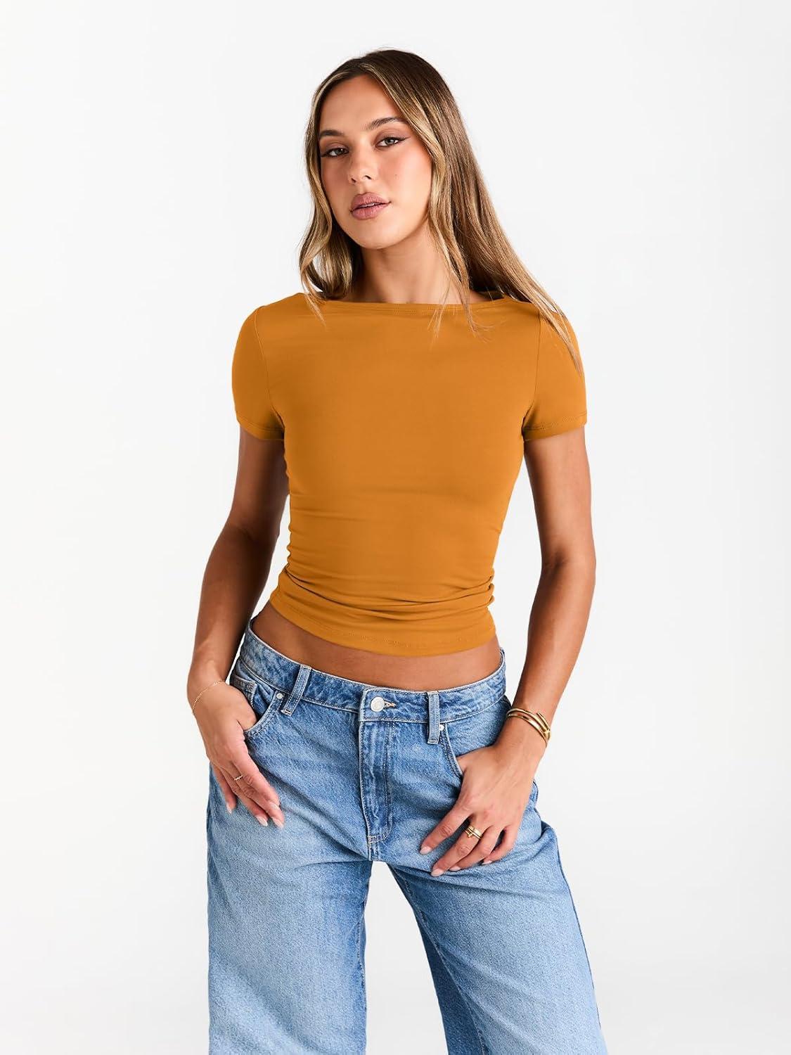 Trendy Queen Womens Boat Neck Short Sleeve T-Shirts Fitted Compression Summer Y2k Basic Tops 2026 Spring Outfits Clothes(Golden Ochre)