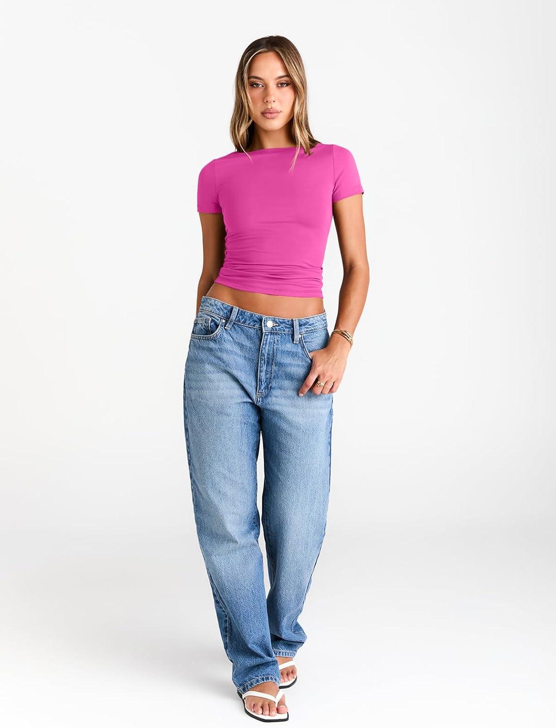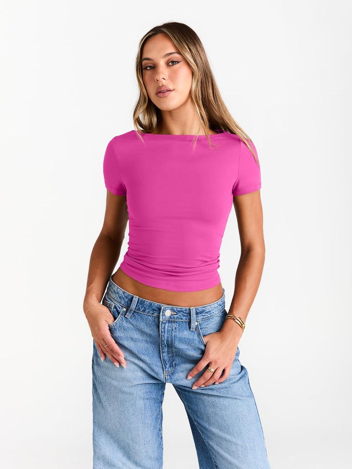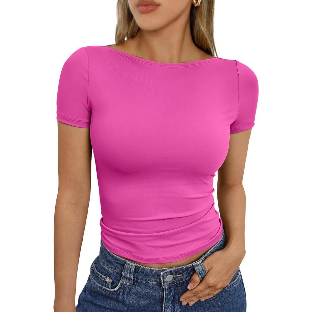 Trendy Queen Womens Boat Neck Short Sleeve T-Shirts Fitted Compression Summer Y2k Basic Tops 2026 Spring Outfits Clothes(Hot Pink)