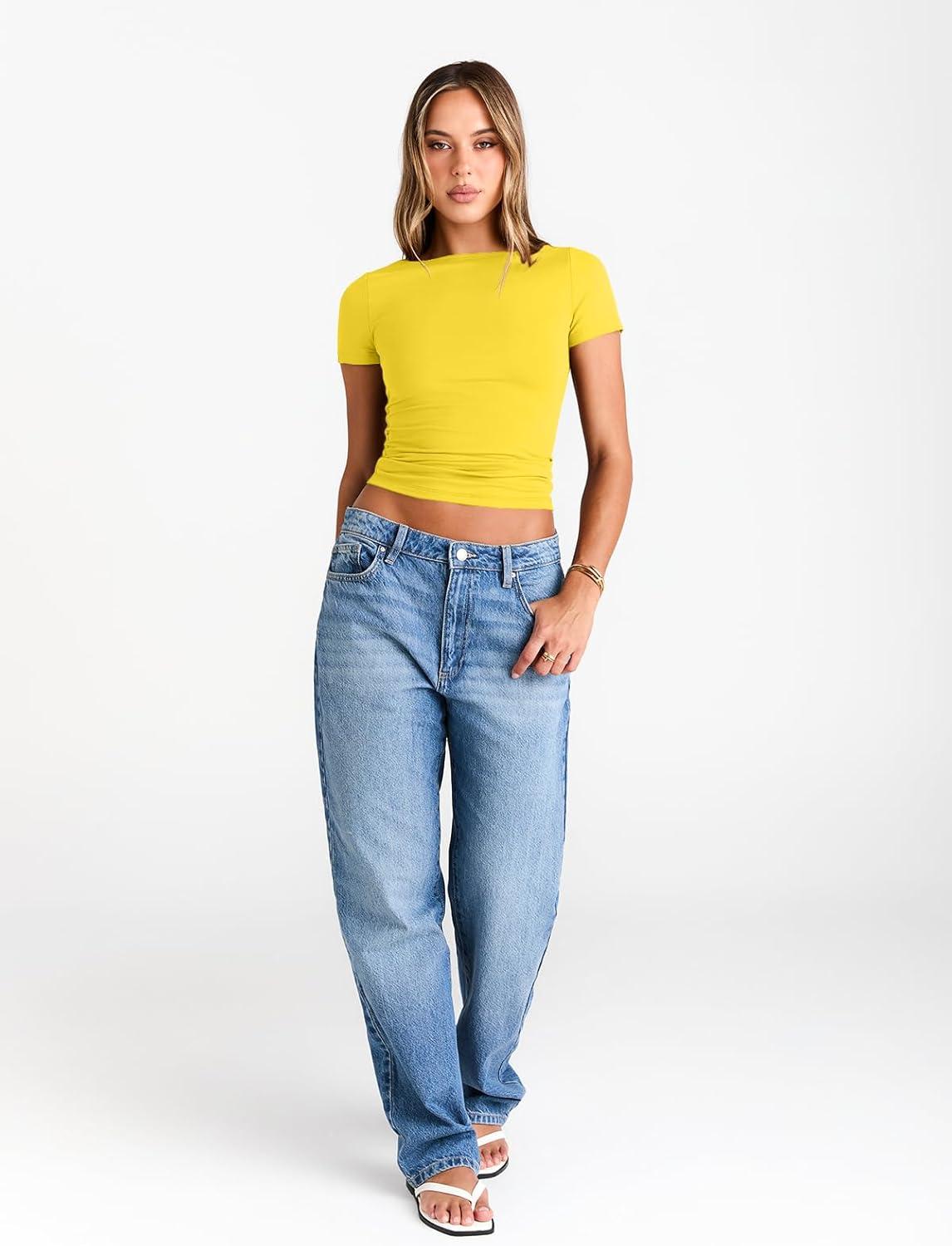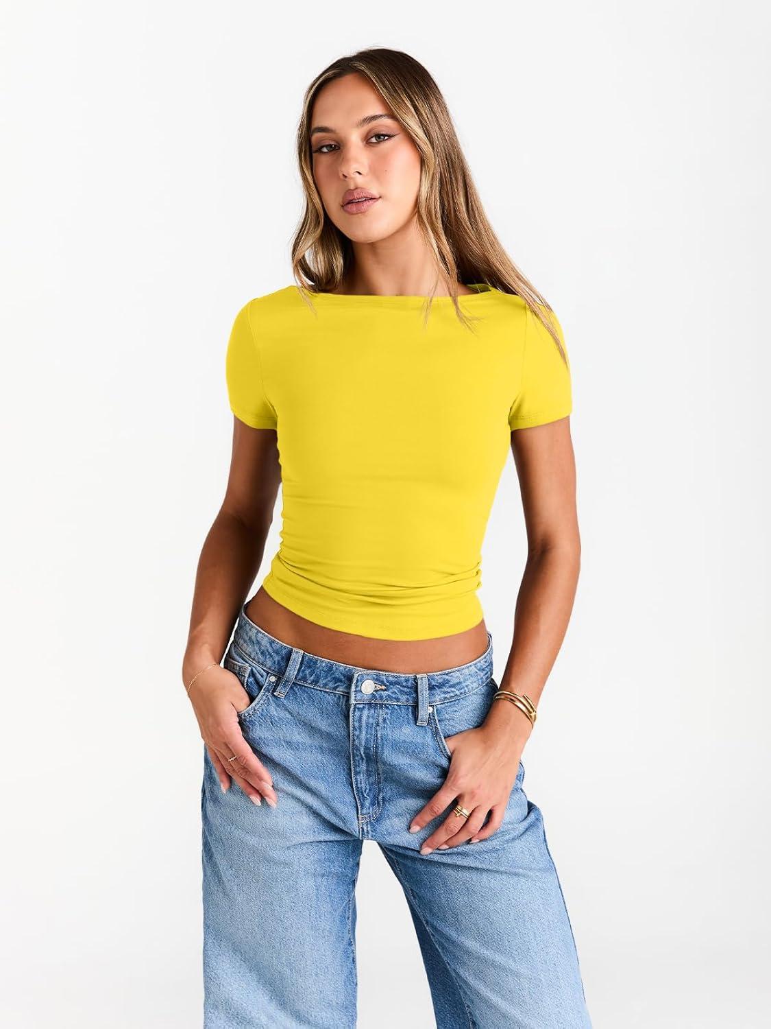 Trendy Queen Womens Boat Neck Short Sleeve T-Shirts Fitted Compression Summer Y2k Basic Tops 2026 Spring Outfits Clothes(Yellow)