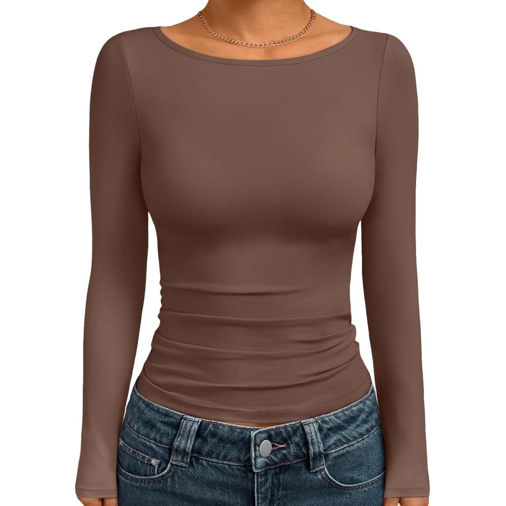Trendy Queen Women’s Boat Neck Tops Long Sleeve Shirts Casual Fitted Tee Shirts Solid Color Fall Basic Clothes 2026(Brown)