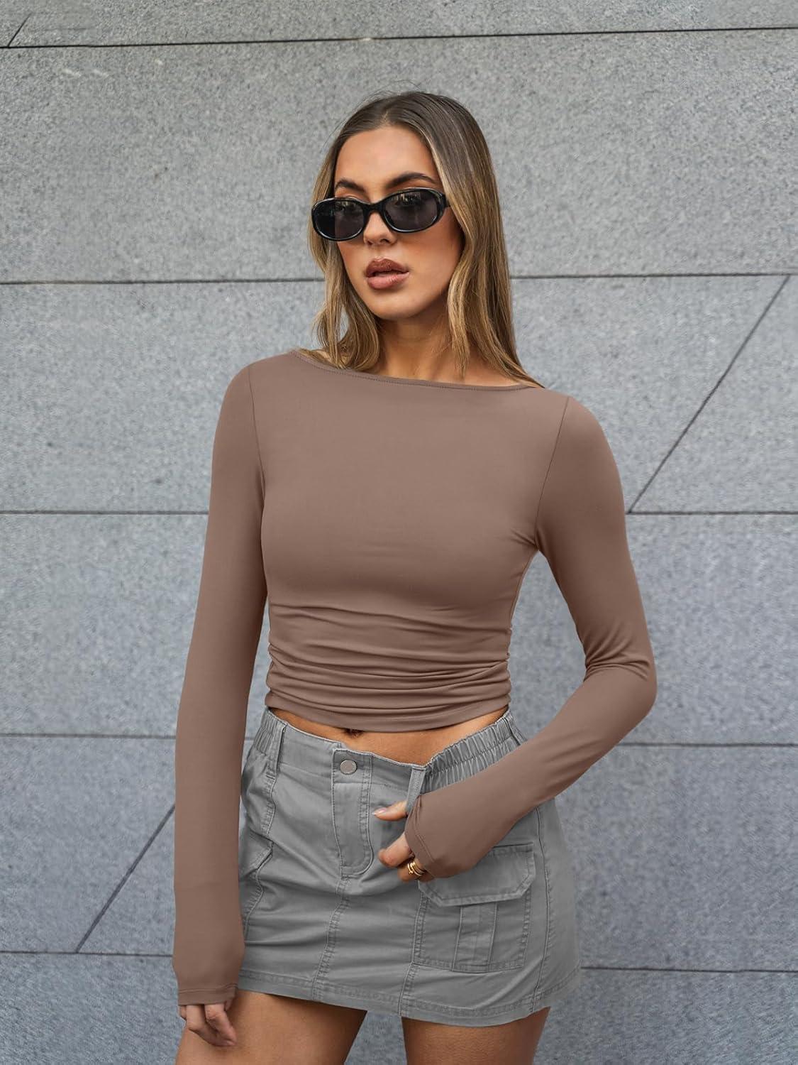 Trendy Queen Women’s Boat Neck Tops Long Sleeve Shirts Casual Fitted Tee Shirts Solid Color Fall Basic Clothes(Coffeegray)