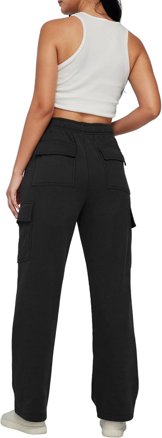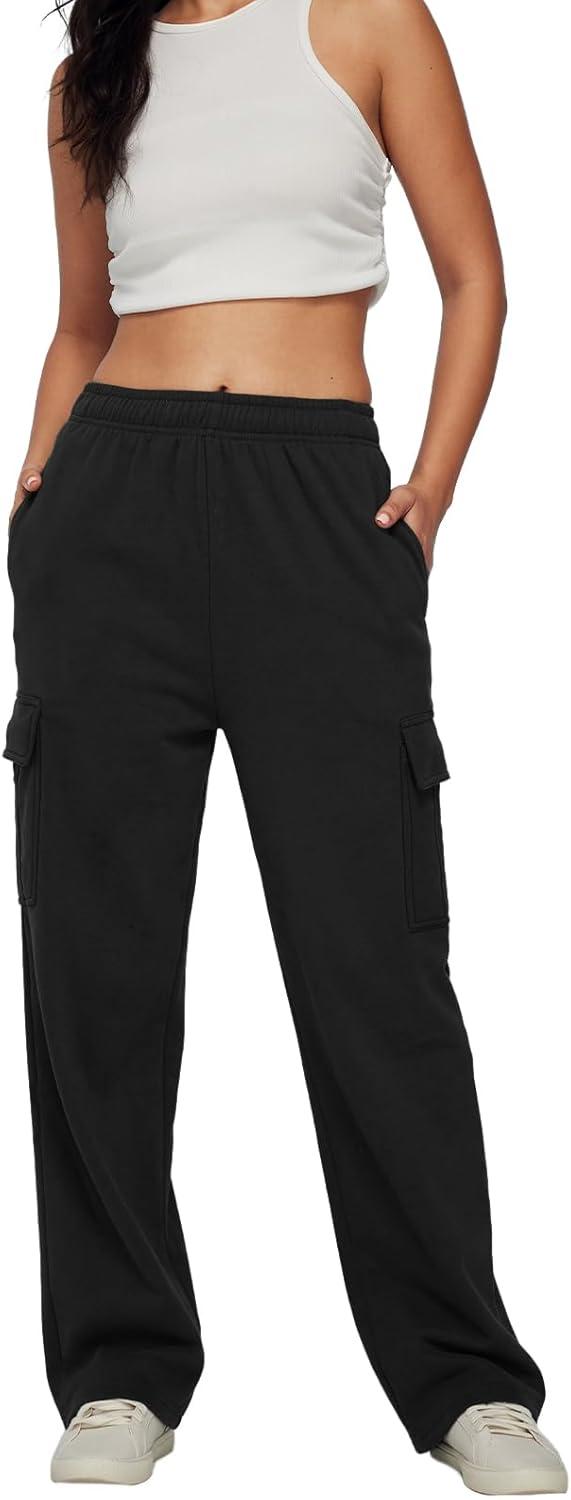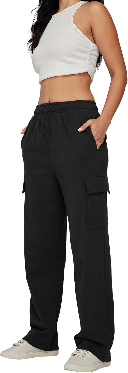 Trendy Queen Womens Cargo Sweatpants Wide Leg Baggy Fleece High Waisted Sweats Pants Winter Clothes with Pockets(Black)