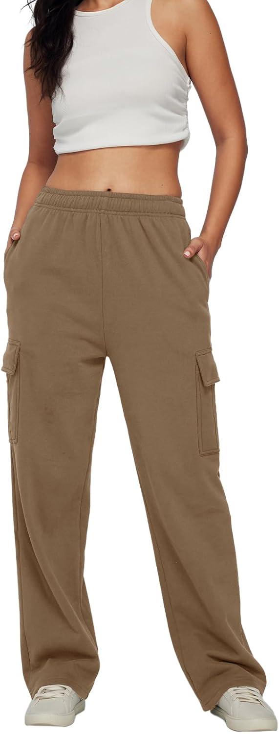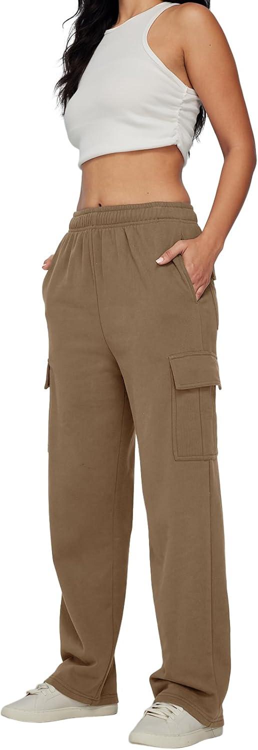 Trendy Queen Womens Cargo Sweatpants Wide Leg Baggy Fleece High Waisted Sweats Pants Winter Clothes with Pockets(Coffee)