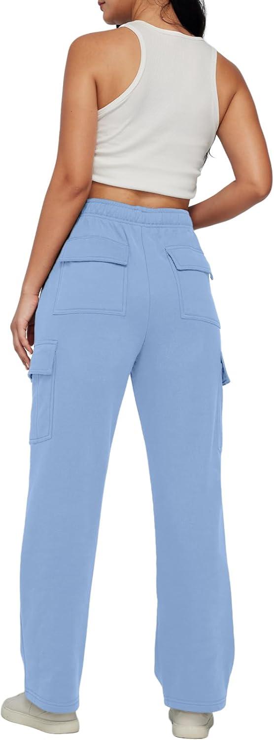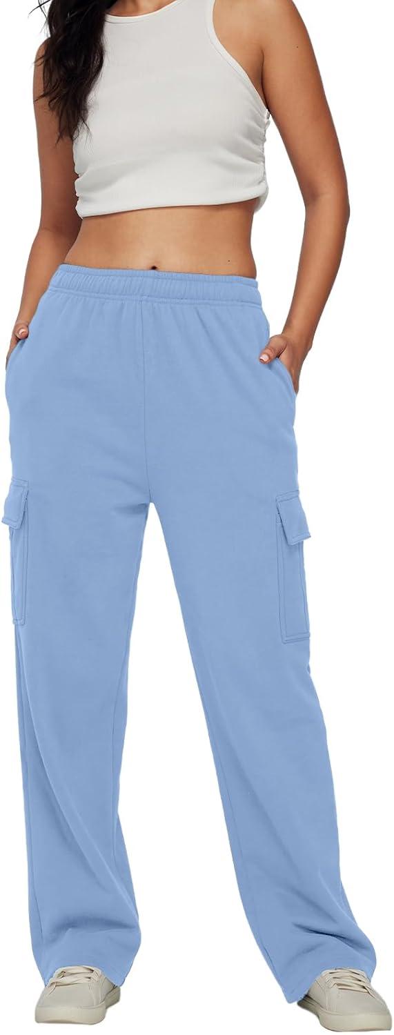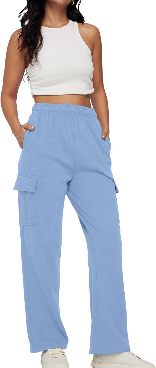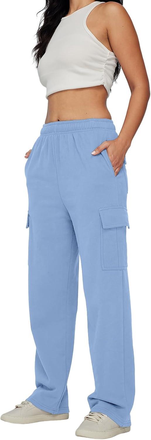 Trendy Queen Womens Cargo Sweatpants Wide Leg Baggy Fleece High Waisted Sweats Pants Winter Clothes with Pockets(Skyblue)