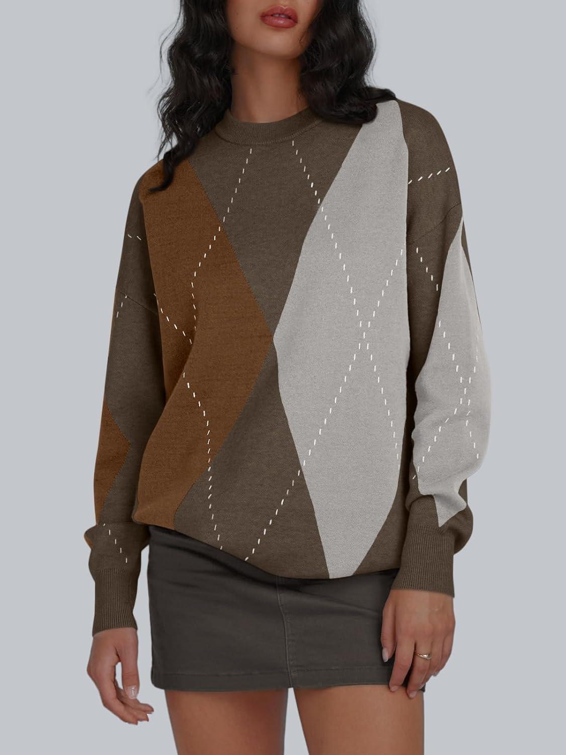 Trendy Queen Women's Color Block Argyle Plaid Oversized Chunky Knit Crewneck Sweaters 2025(Nutmeg Brown)