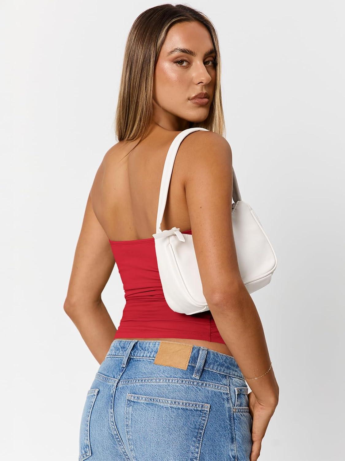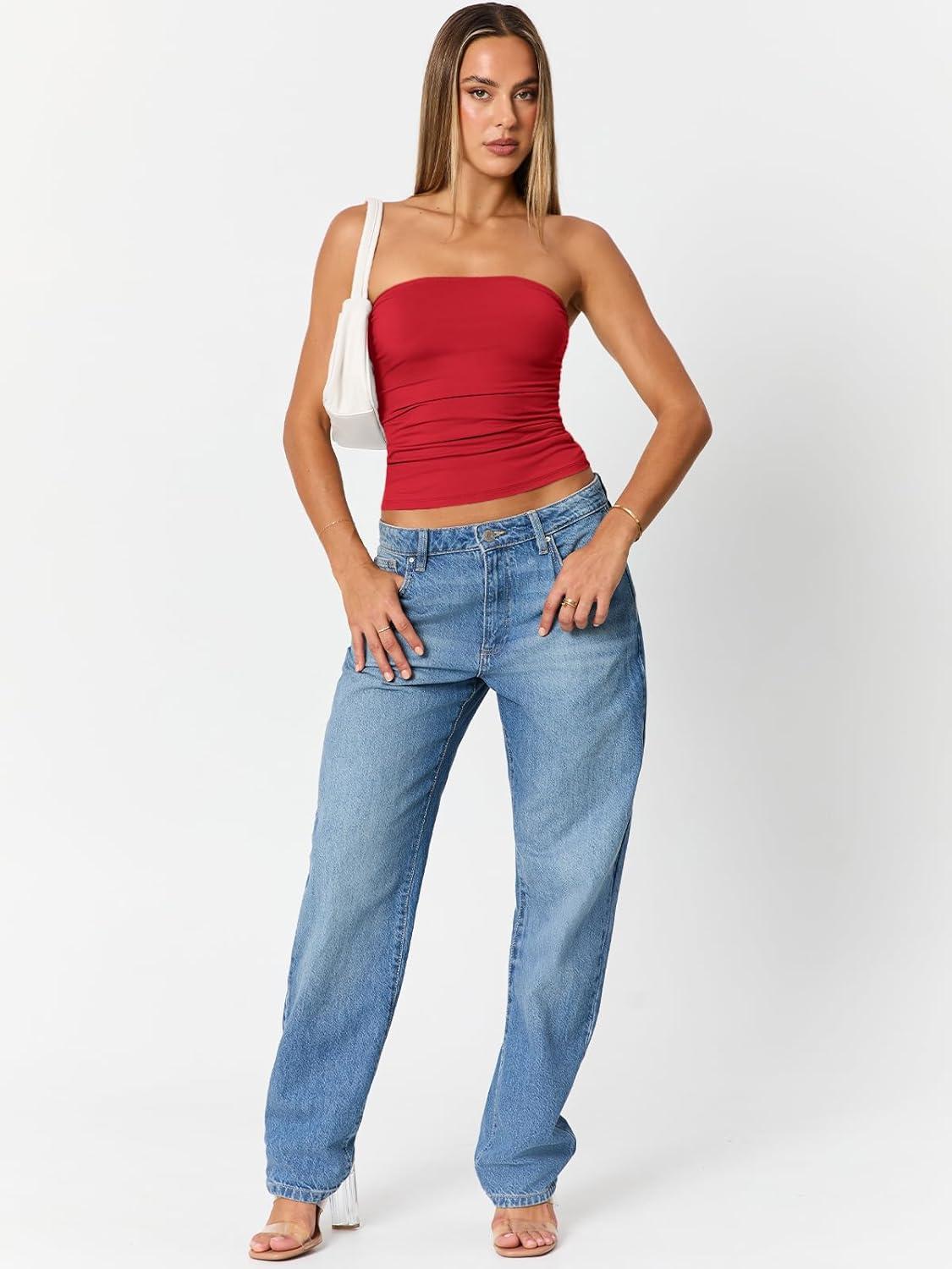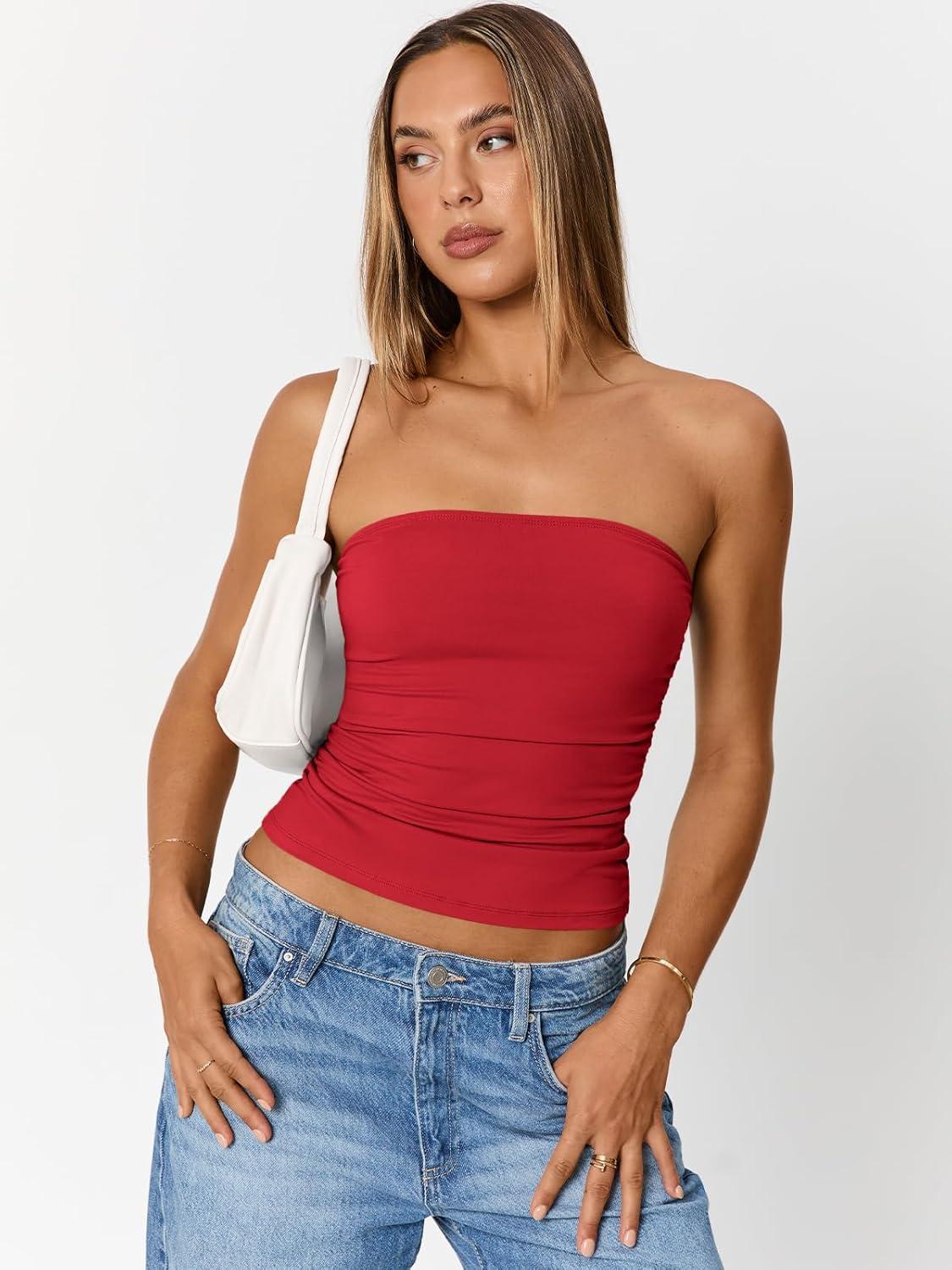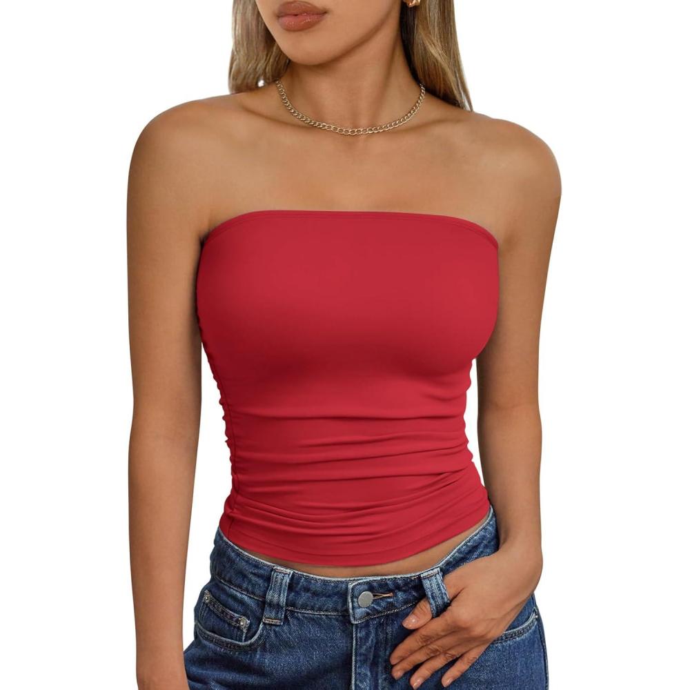 Trendy Queen Womens Cute Summer Tube Tops Going Out Strapless Ruched Backless Sleeveless Bandeau Y2k Clothes 2025(Red)