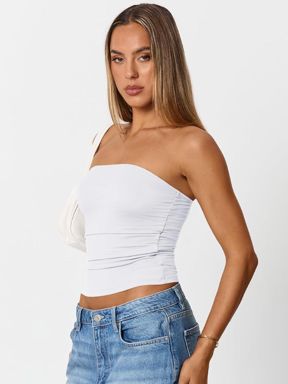 Trendy Queen Womens Cute Summer Tube Tops Going Out Strapless Ruched Backless Sleeveless Bandeau Y2k Clothes 2025(White)