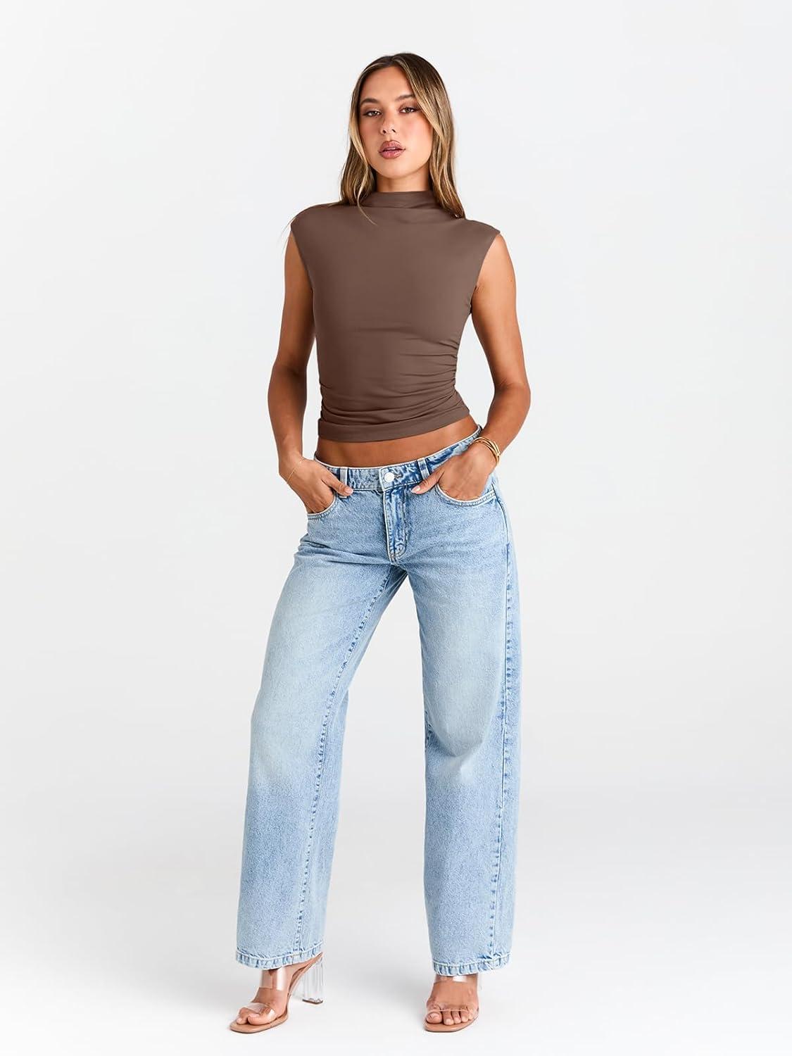 Trendy Queen Women’s Going Out Basic Tank Tops Mock Neck Spring Clothes Sleeveless Cute Shirts Summer Y2K Sexy Outfits 2025(Brown)