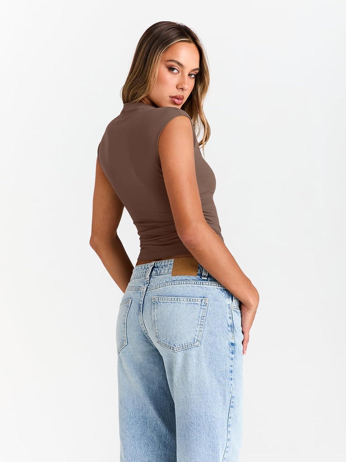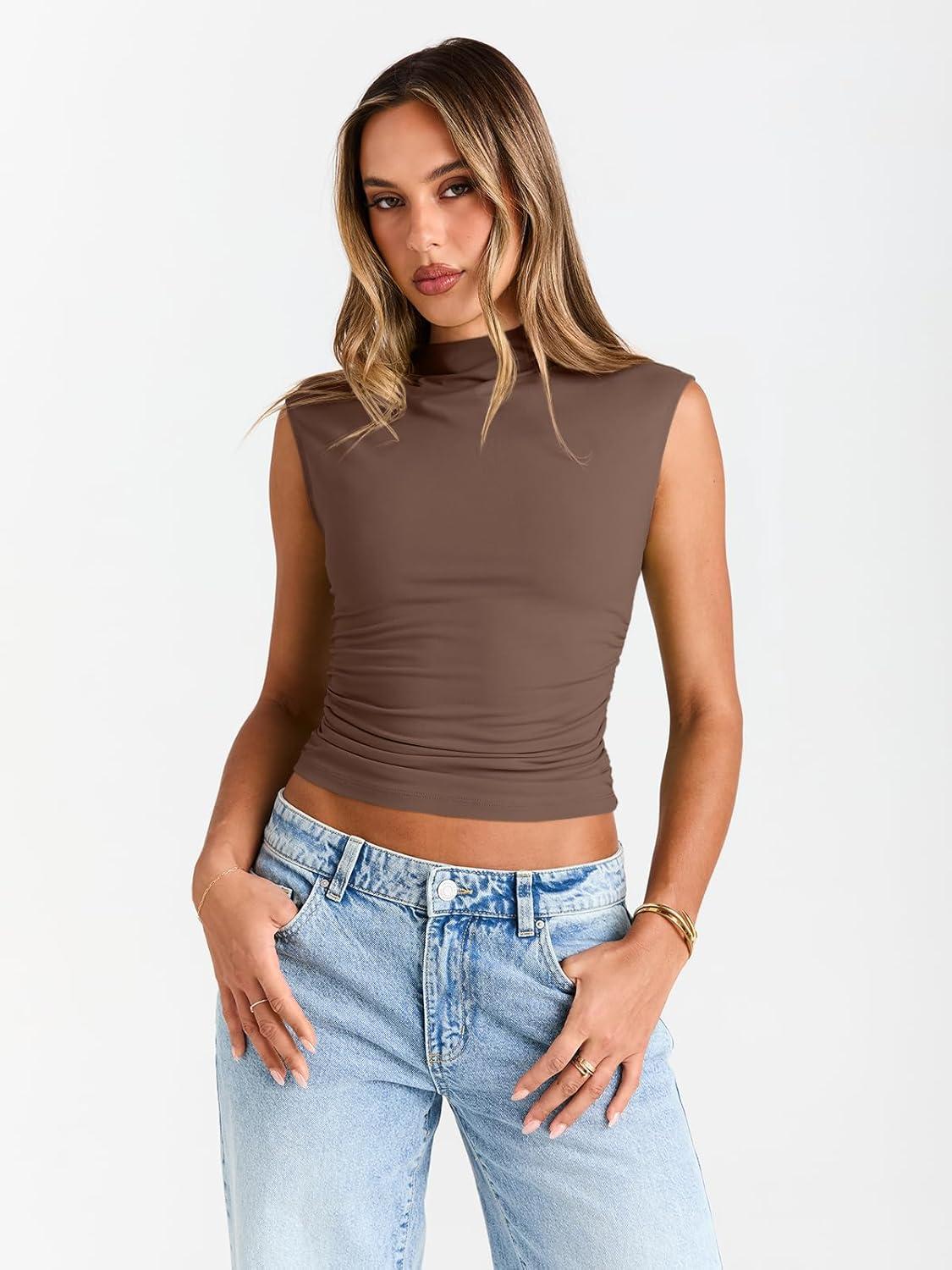 Trendy Queen Women's Going Out Basic Tank Tops Mock Neck Spring Clothes Sleeveless Cute Shirts Summer Y2K Sexy Outfits 2025(Brown)