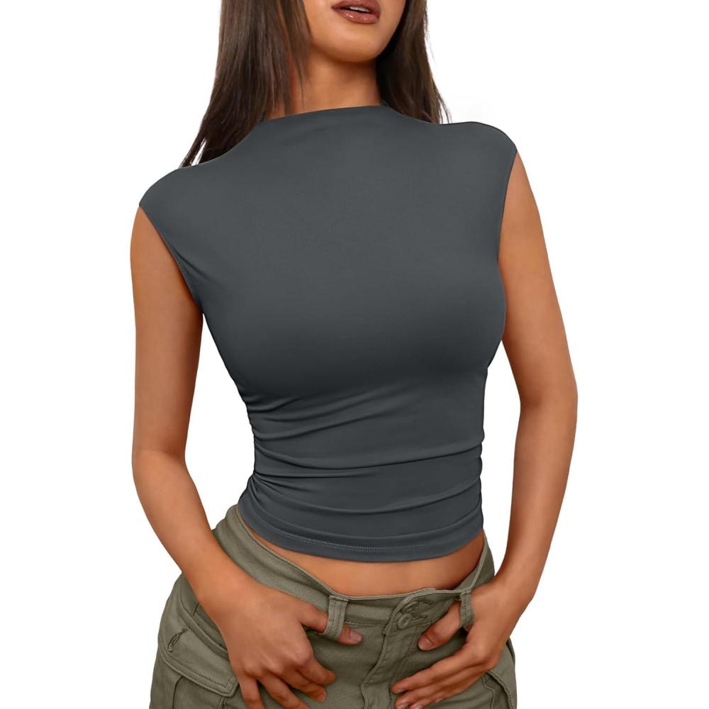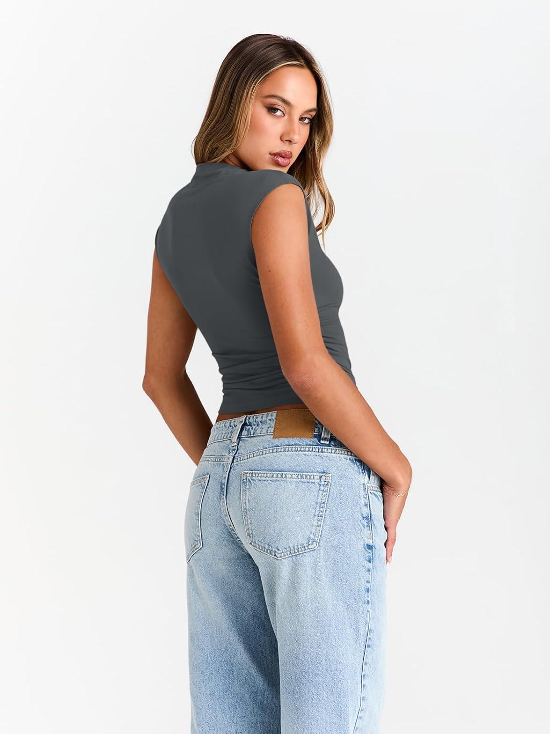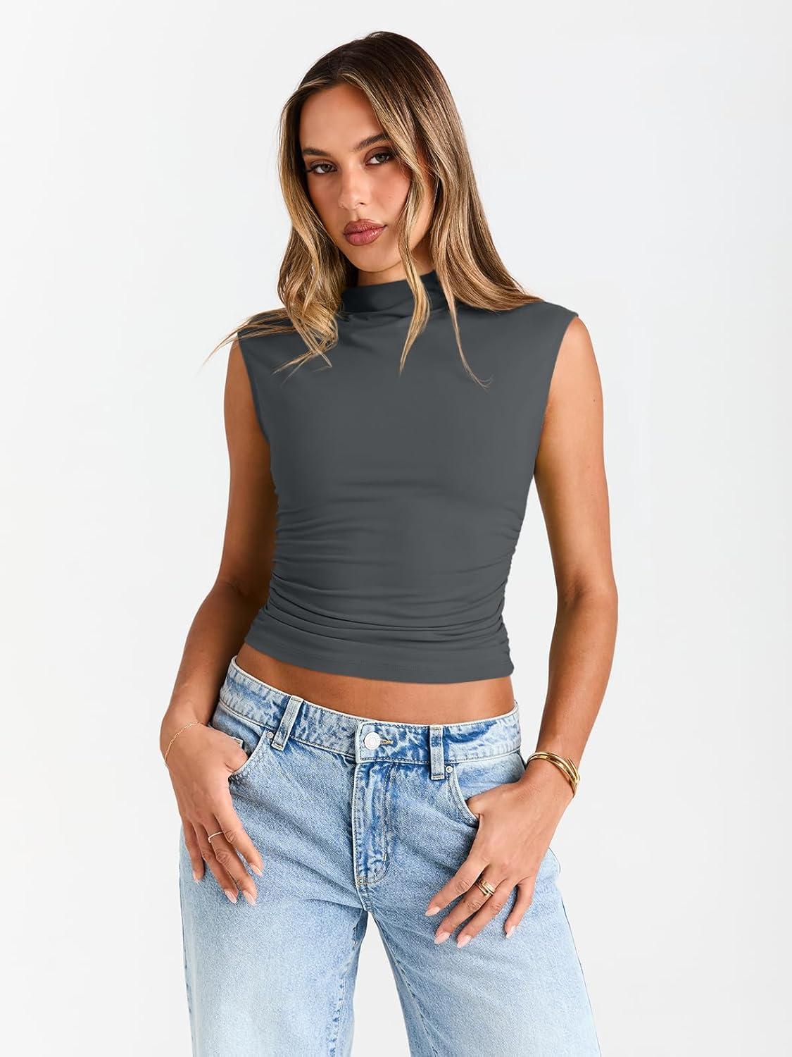 Trendy Queen Women's Going Out Basic Tank Tops Mock Neck Spring Clothes Sleeveless Cute Shirts Summer Y2K Sexy Outfits 2025(Grey)