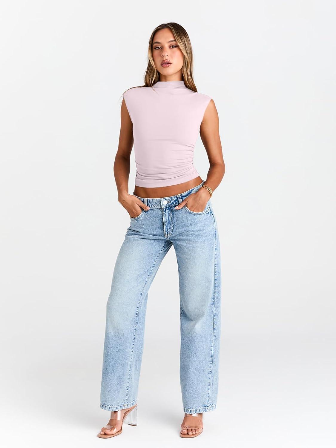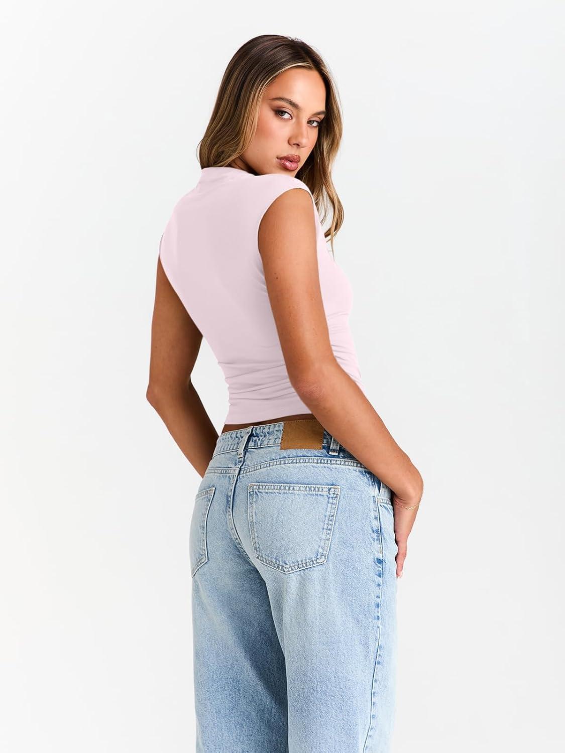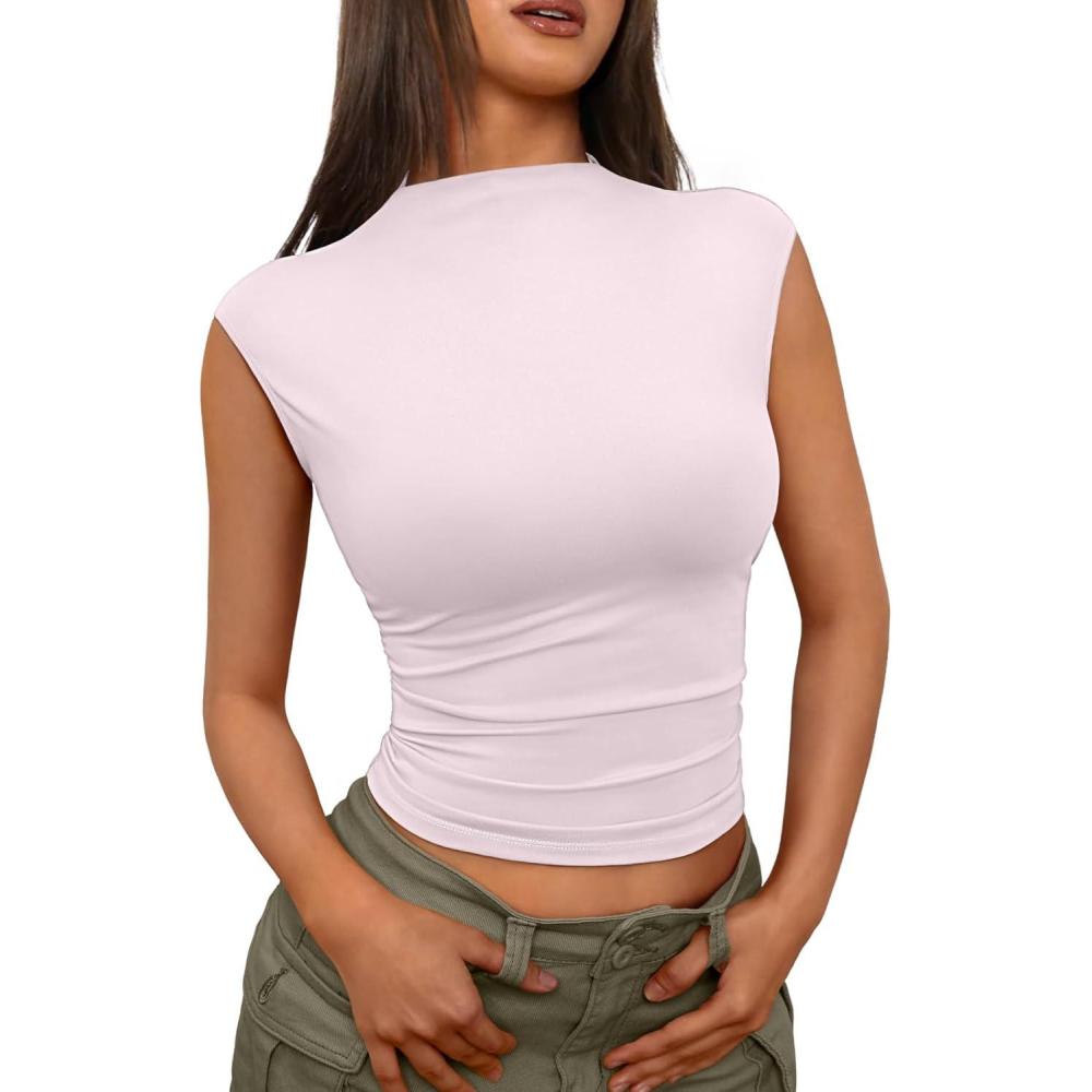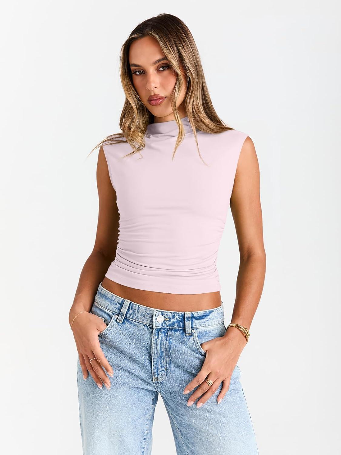 Trendy Queen Women’s Going Out Basic Tank Tops Mock Neck Spring Clothes Sleeveless Cute Shirts Summer Y2K Sexy Outfits 2026(Pink)
