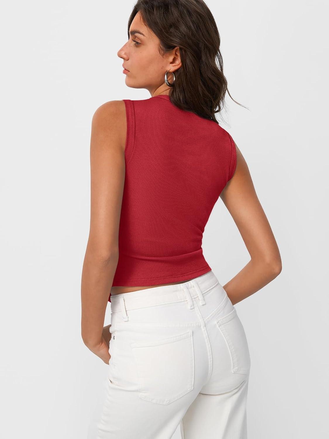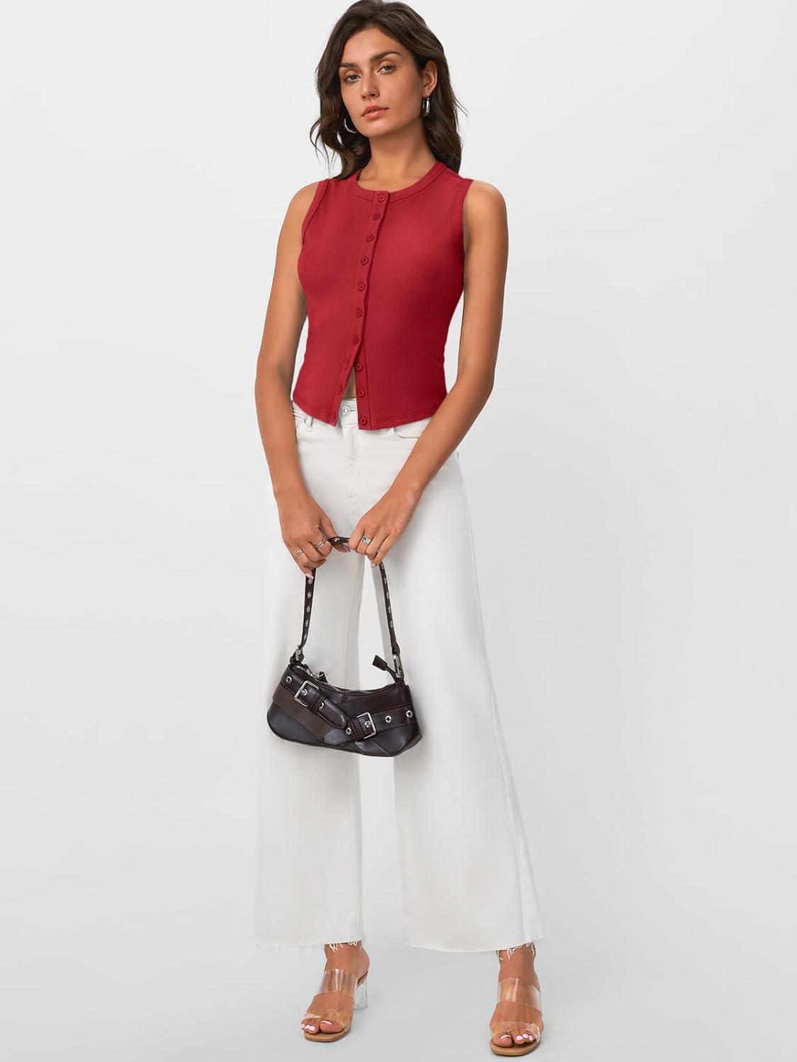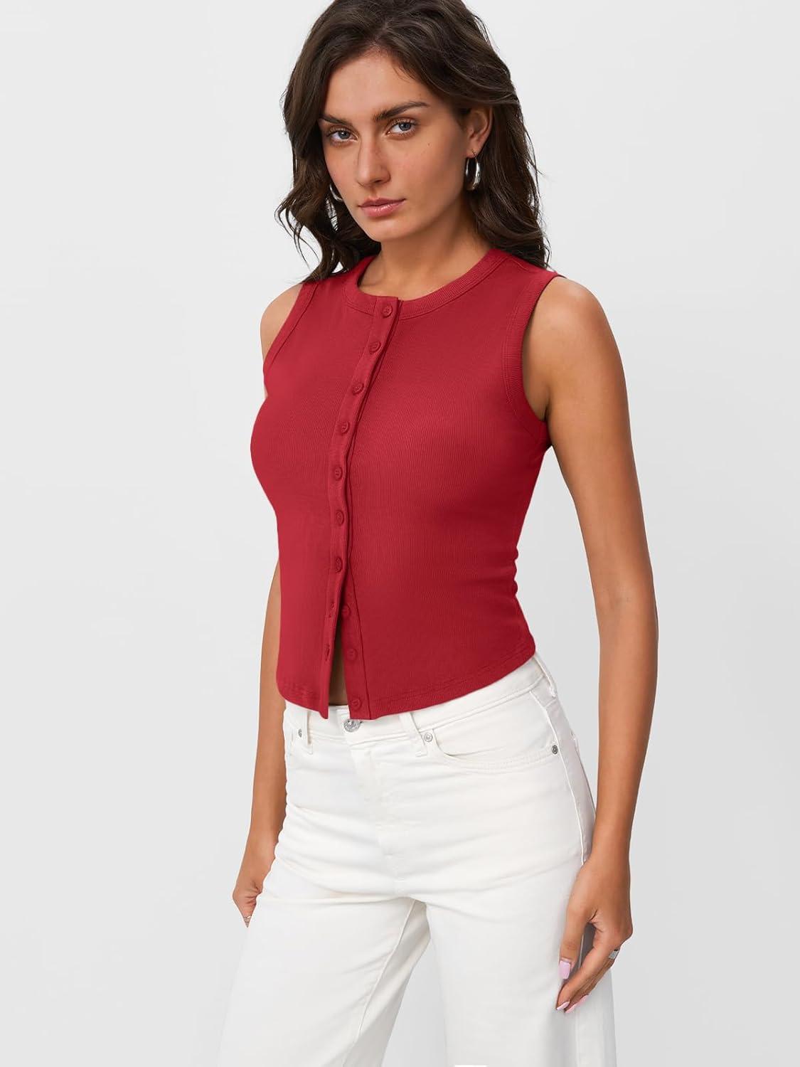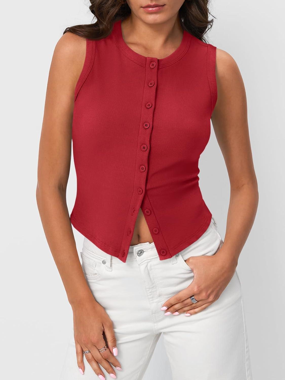 Trendy Queen Womens Going Out Tank Top Ribbed Button Down Sleeveless Vest Crop Spring Beach Vacation Summer Tops(Red)