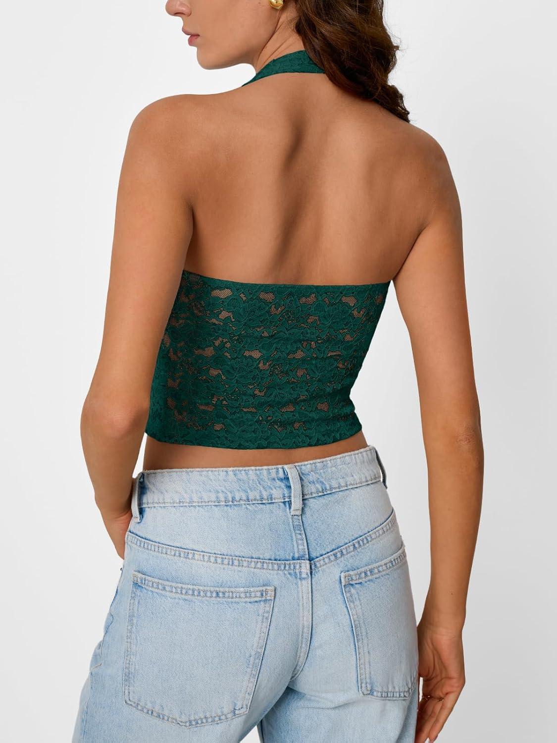 Trendy Queen Womens Going Out Tops Lace V-Neck Sleeveless Double Lined Halter Y2K Sexy Crop Summer Fashion Tank Top 2026(Green)