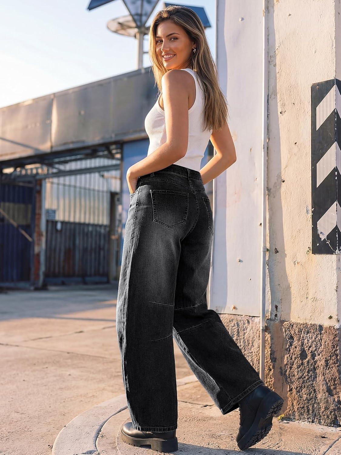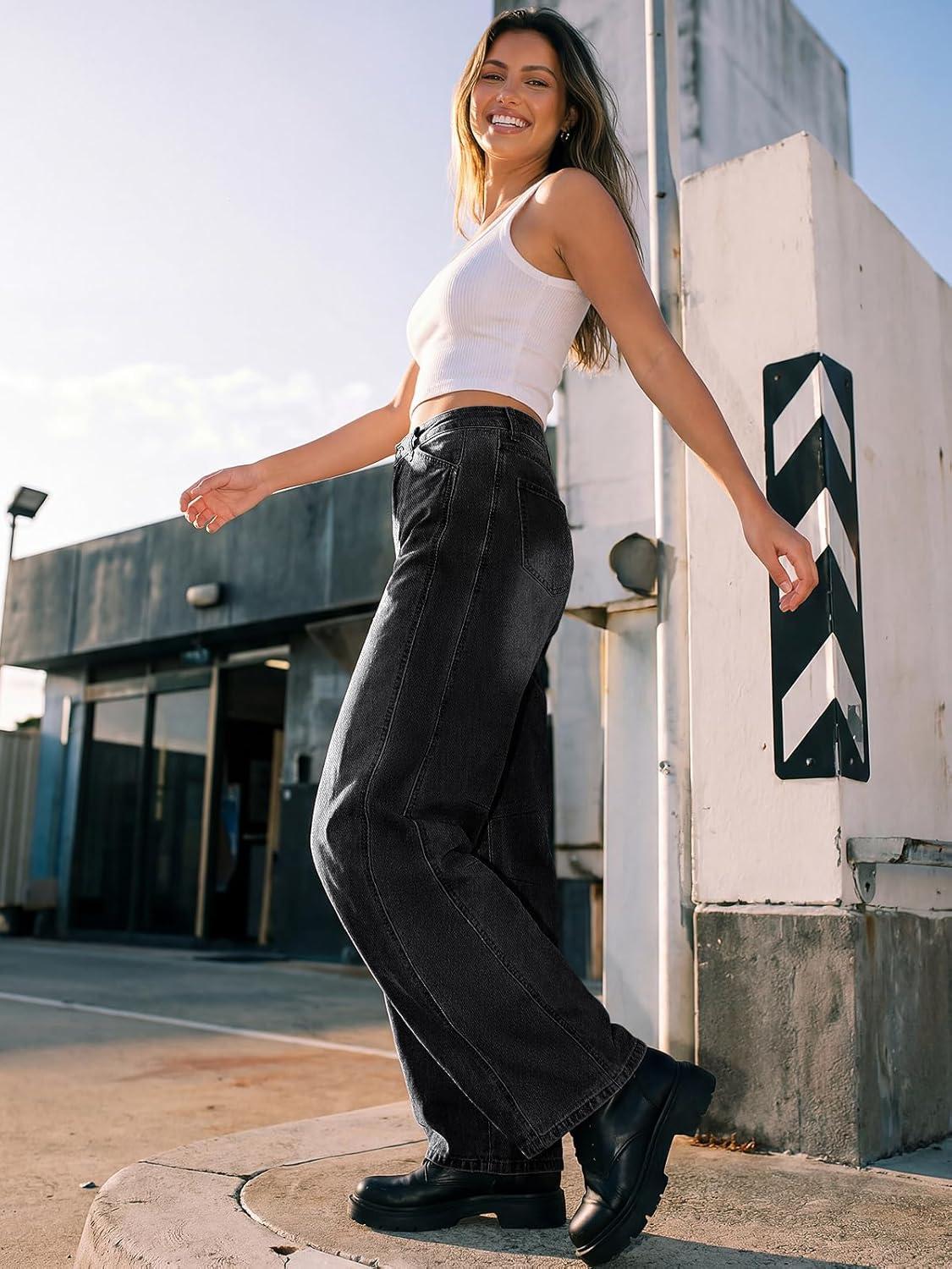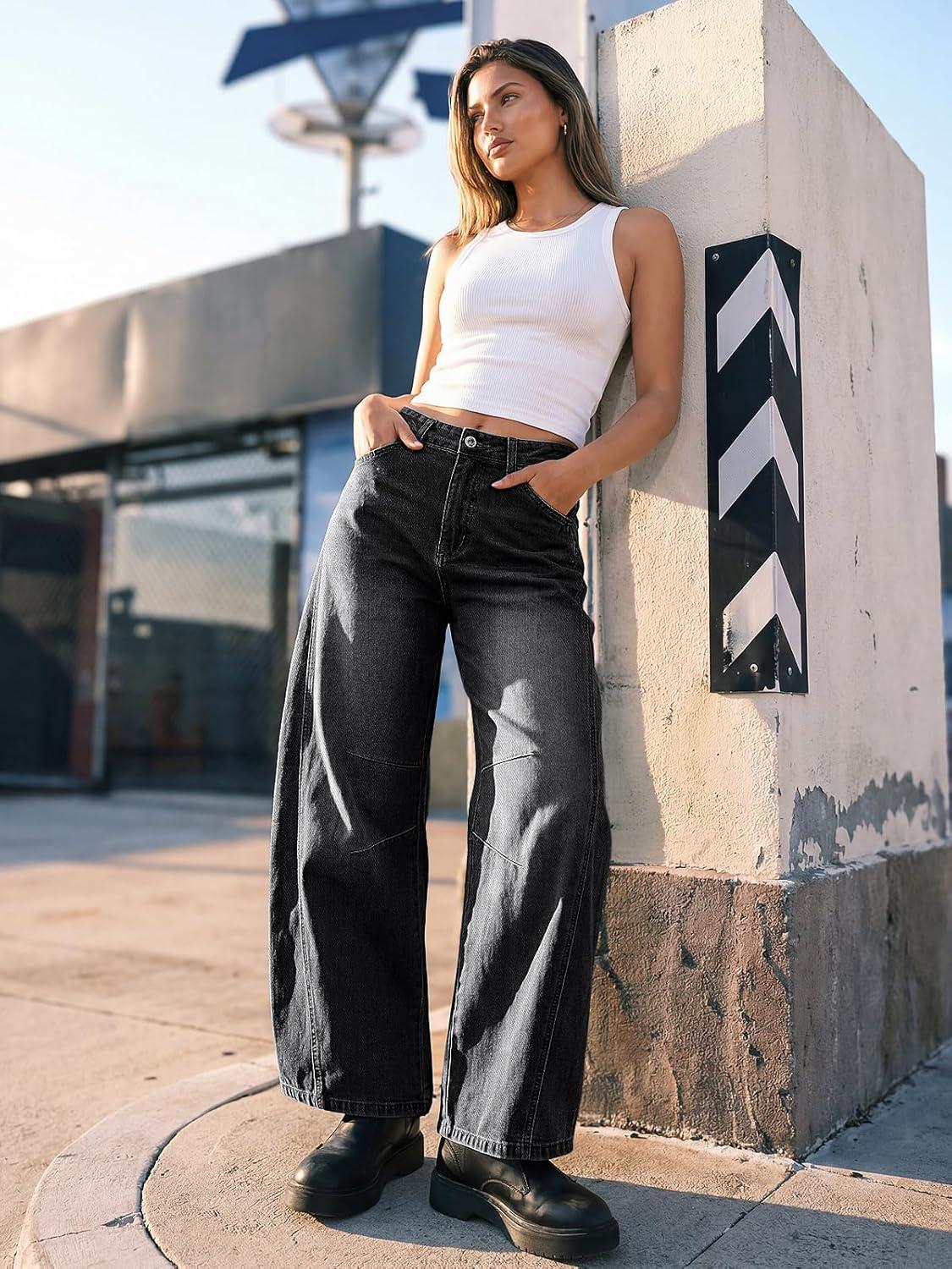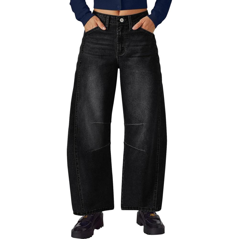 Trendy Queen Women's High Waisted Barrel Jeans - Wide Leg & Curved Hem Denim Pants with Slant Pockets(Black)