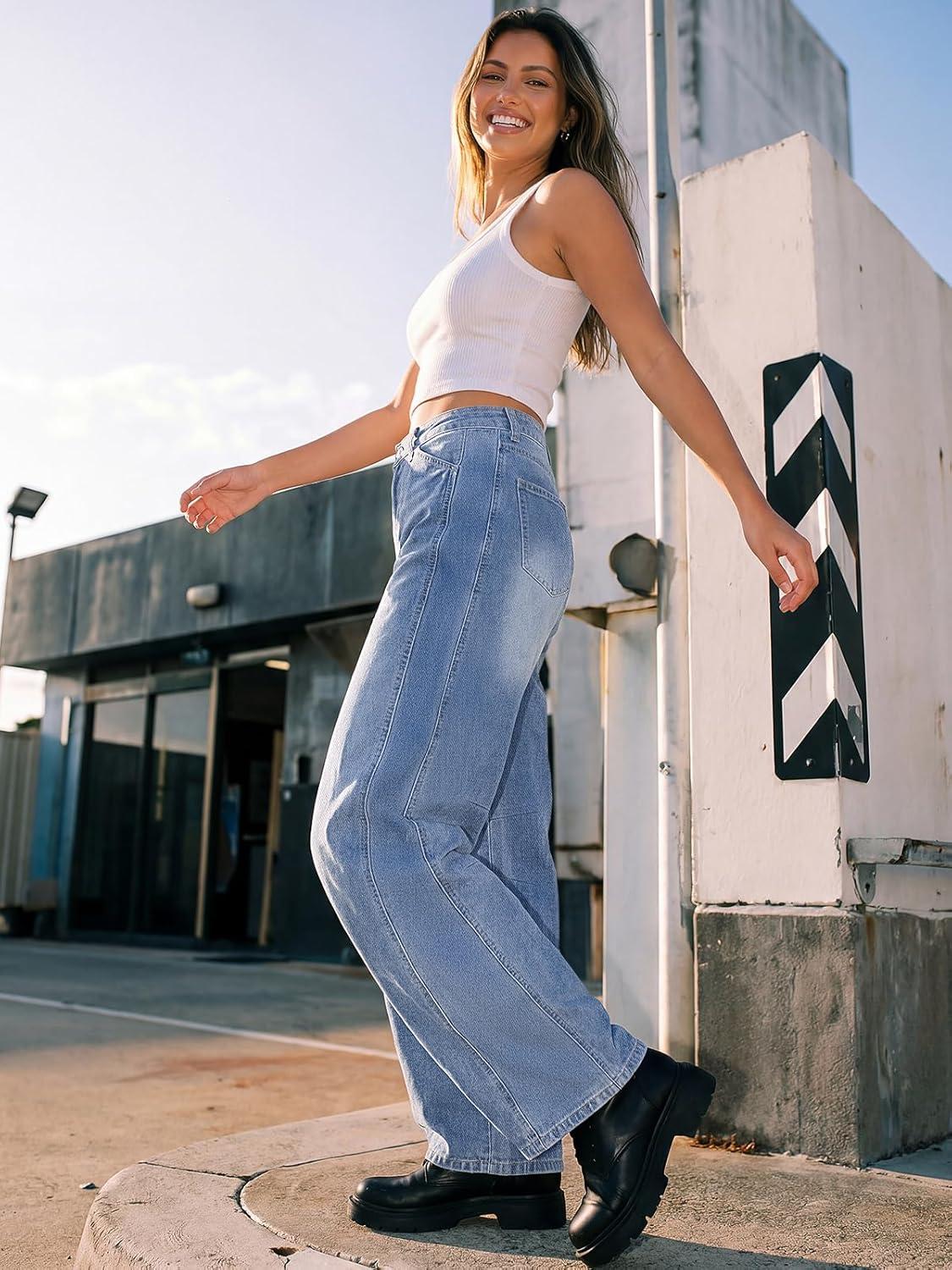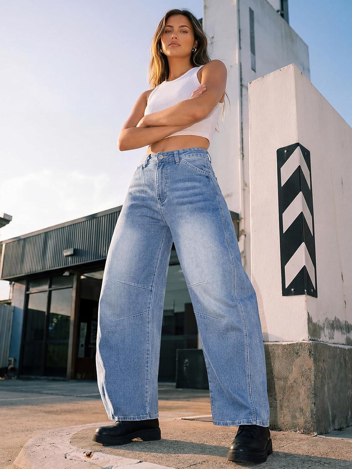 Trendy Queen Women's High Waisted Barrel Jeans - Wide Leg & Curved Hem Denim Pants with Slant Pockets(Iceland Blue)