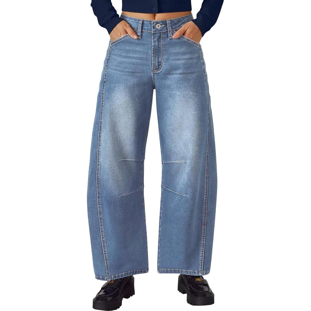 Trendy Queen Women’s High Waisted Barrel Jeans – Wide Leg & Curved Hem Denim Pants with Slant Pockets(Blue)