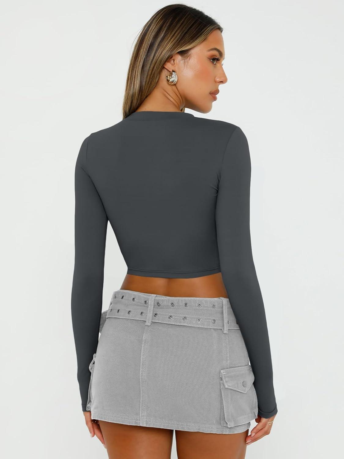 Trendy Queen Womens Long Sleeve Crop Tops Basic Slim Fitted Shirts Fashion 2025 Going Out Y2k Tops Teen Girl Clothes(Gray)