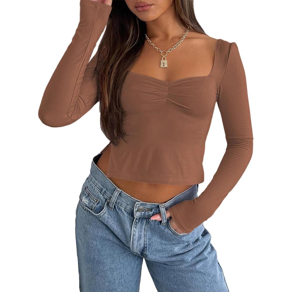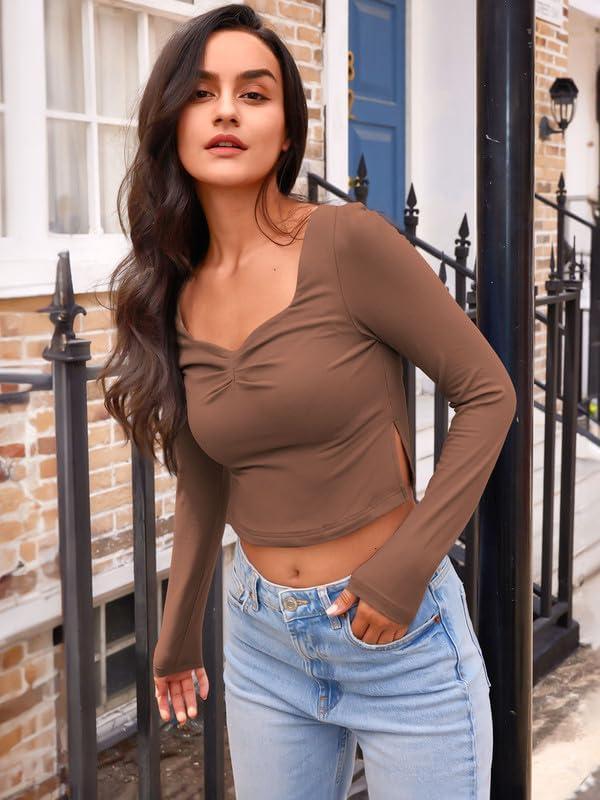 Trendy Queen Womens Long Sleeve Going Out Crop Tops Sweetheart Neck Cute Y2k T Shirts Side Slit Tees(Brown)