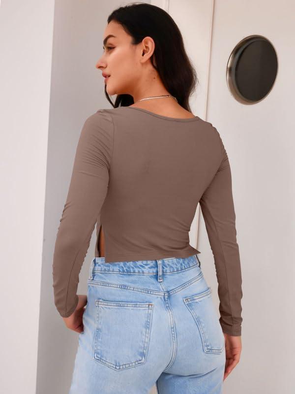 Trendy Queen Womens Long Sleeve Going Out Crop Tops Sweetheart Neck Cute Y2k T Shirts Side Slit Tees(Brown)