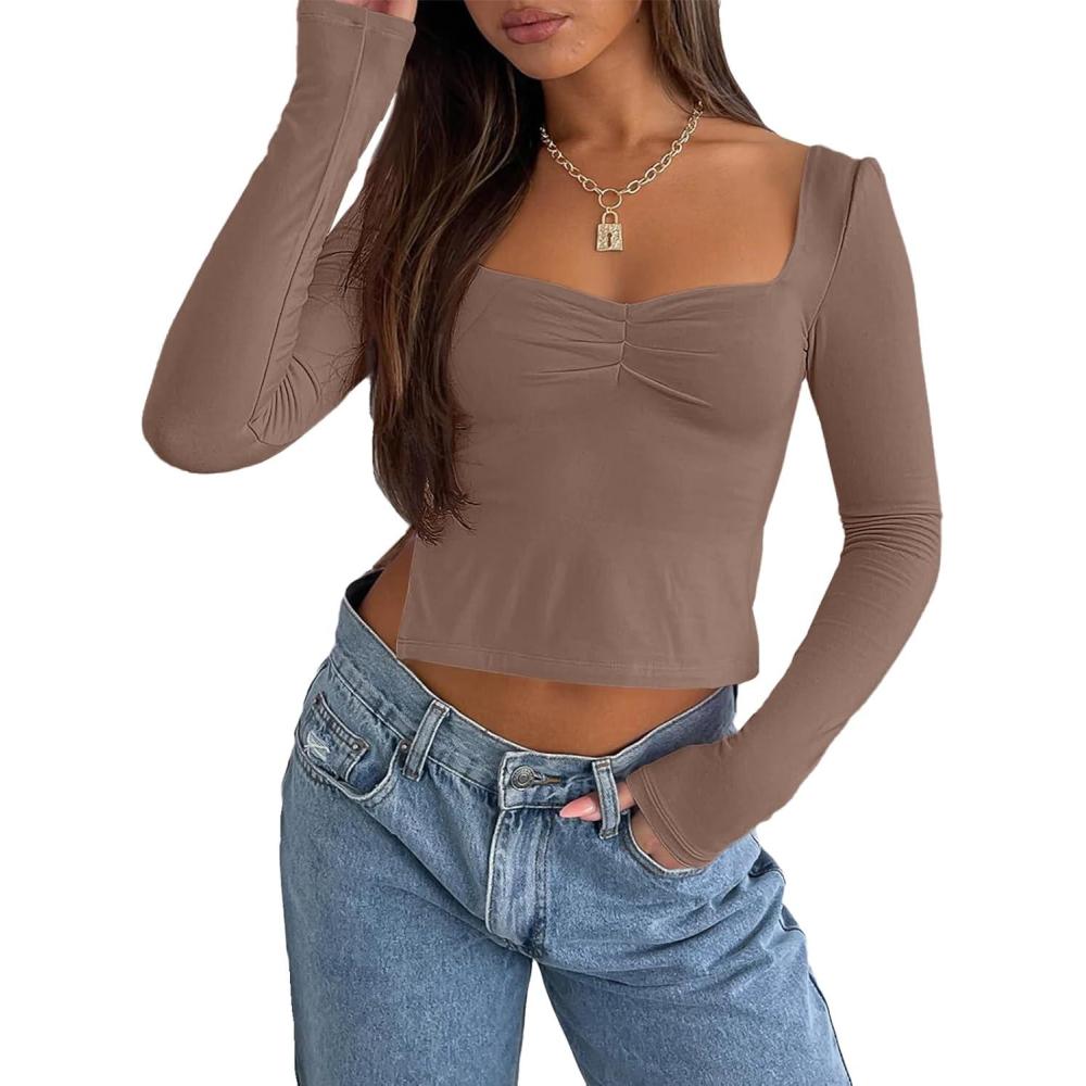 Save up to 40% on Trendy Queen Womens Long Sleeve Going Out Crop Tops Sweetheart Neck Cute Y2k T Shirts Side Slit Tees(Coffe) styles during our end-of-season sale.