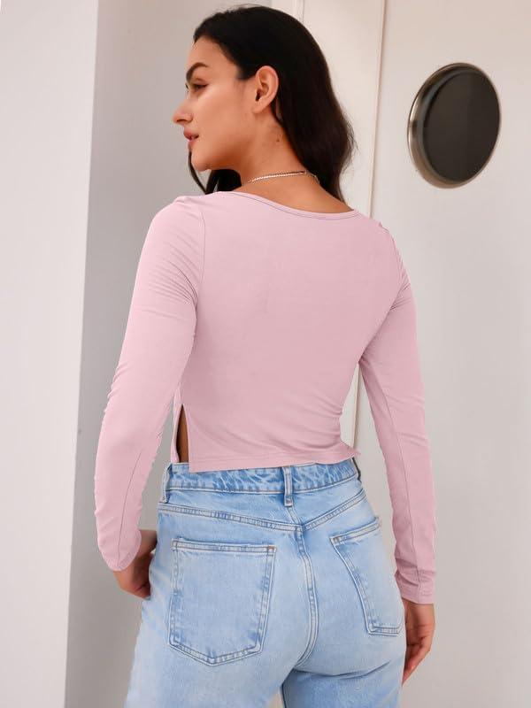Trendy Queen Womens Long Sleeve Going Out Crop Tops Sweetheart Neck Cute Y2k T Shirts Side Slit Tees(Pink)