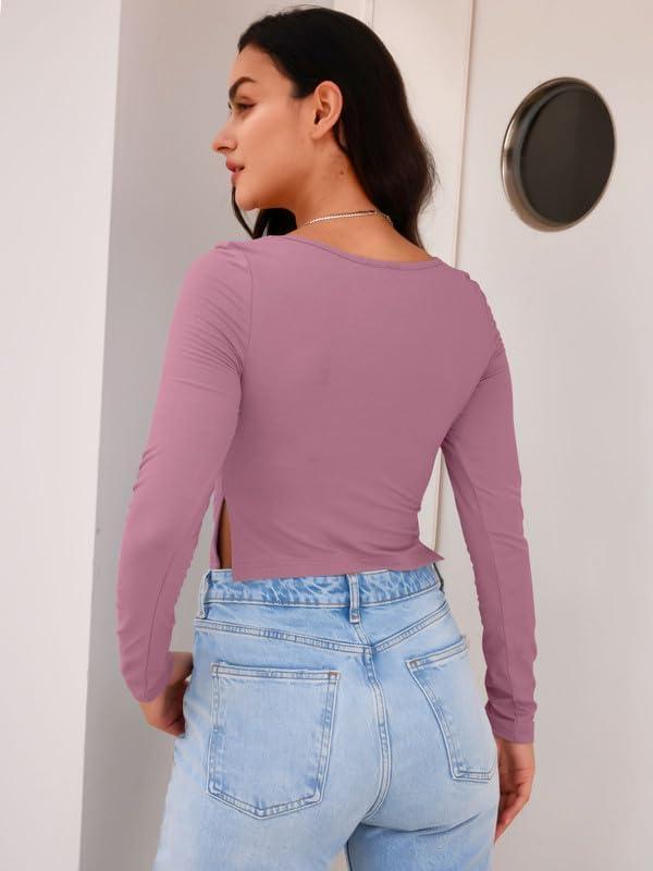 Trendy Queen Womens Long Sleeve Going Out Crop Tops Sweetheart Neck Cute Y2k T Shirts Side Slit Tees(Pinkpurple)