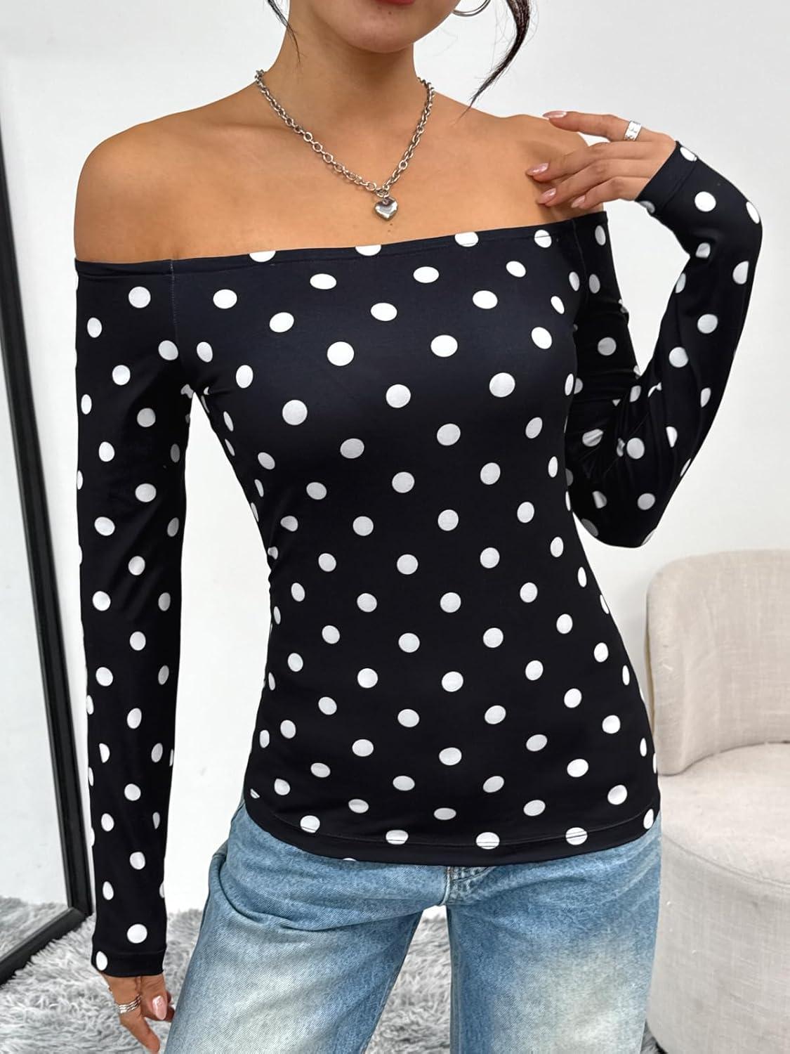 Trendy Queen Womens Long Sleeve Off The Shoulder Tops Going Out Cute Basic Y2K Fall Fashion 2025 Outfits Clothes(Black Dots)