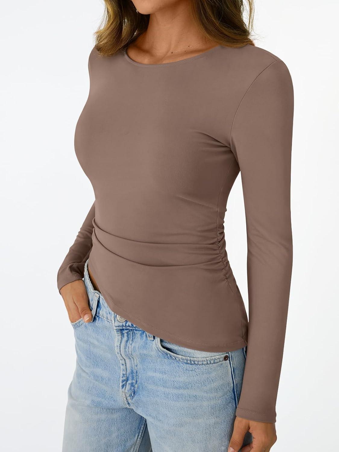 Trendy Queen Womens Long Sleeve Shirts Asymmetrical Ruched Going Out Slim Fit Tees Sexy Cute Y2k Fall Fashion Tops 2025(Coffeegrey)