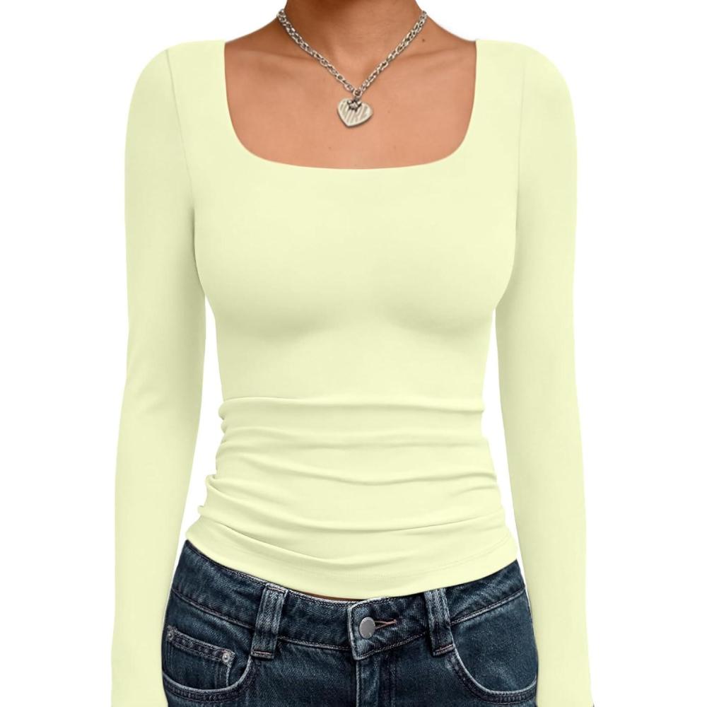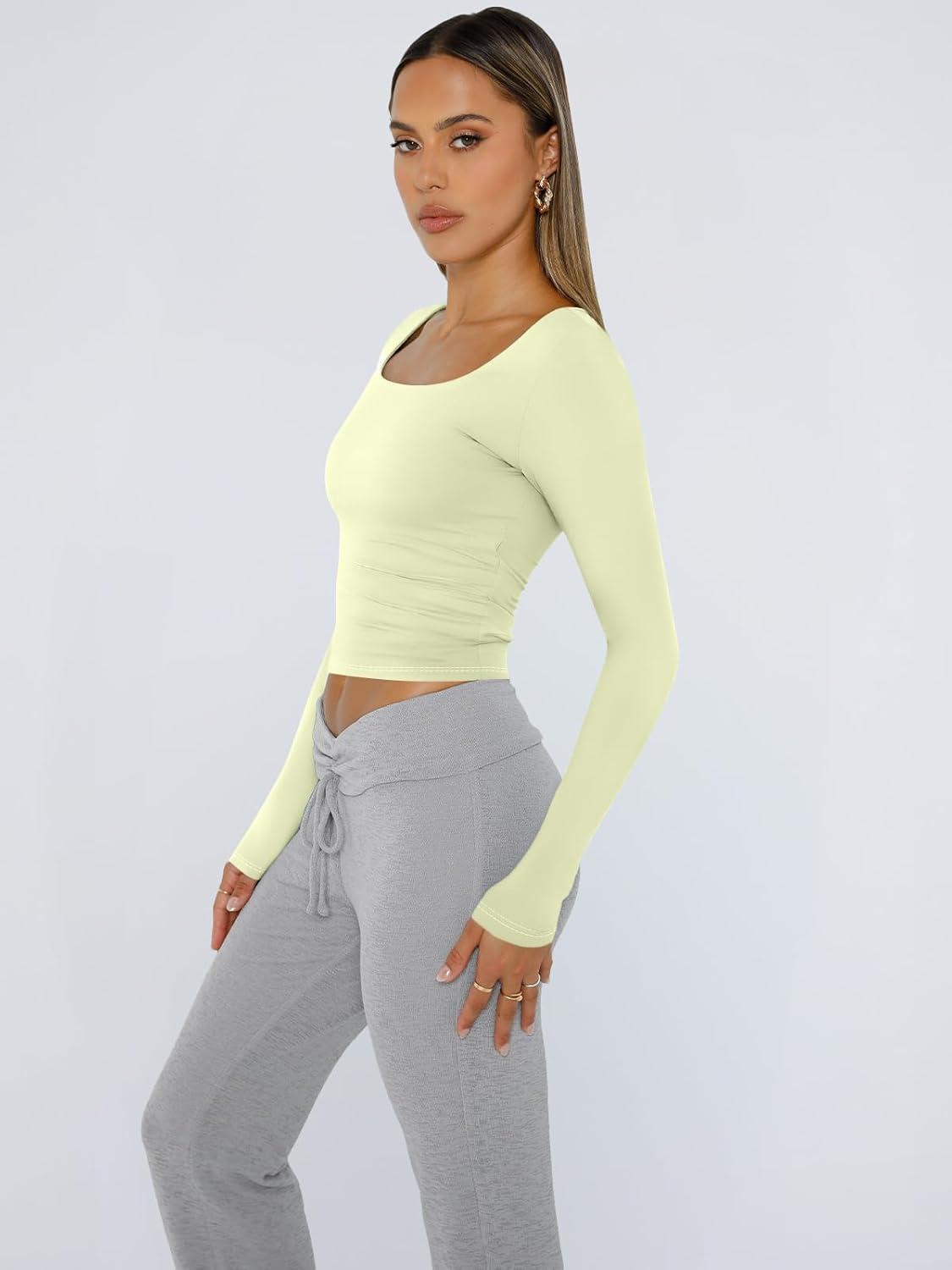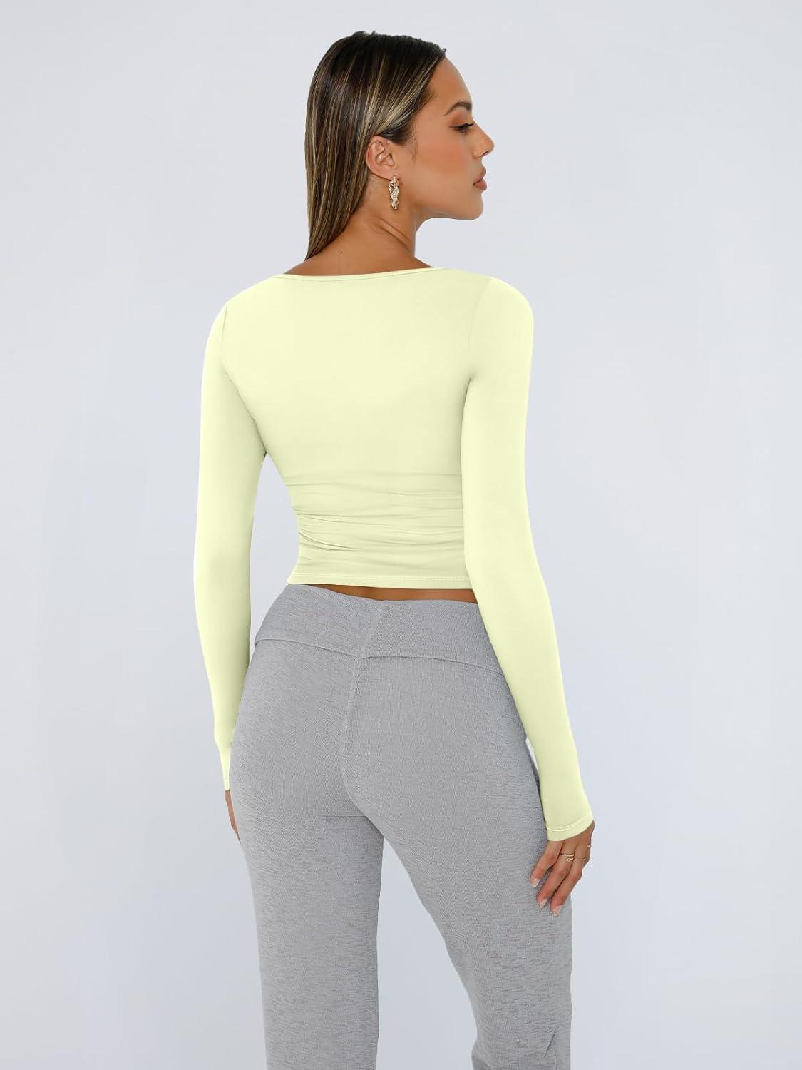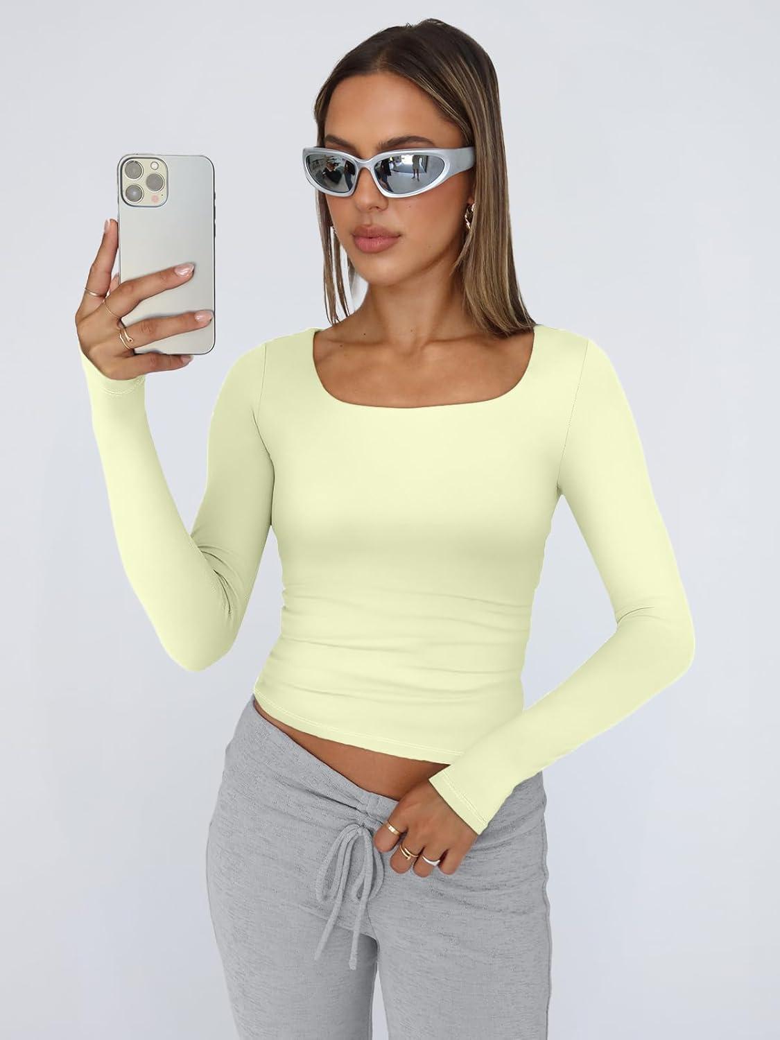 Trendy Queen Womens Long Sleeve Shirts Crop Tops Fall Fashion 2025 Square Neck Going Out Basics Tees Y2k Clothes(Lemon Yellow)