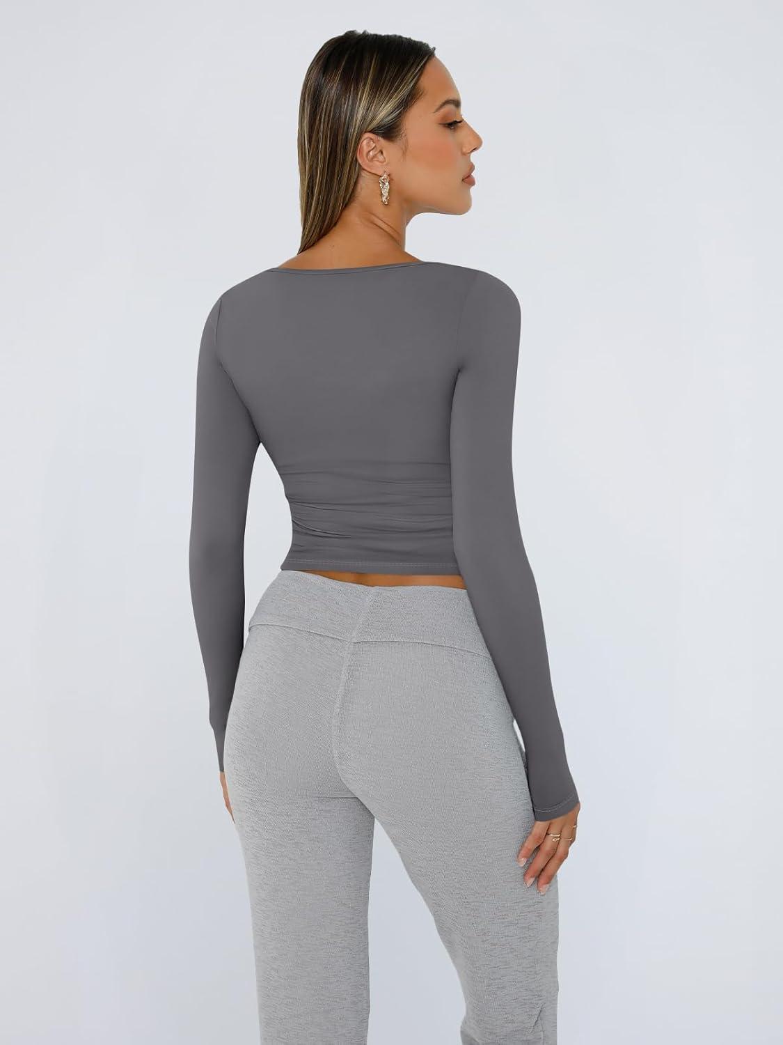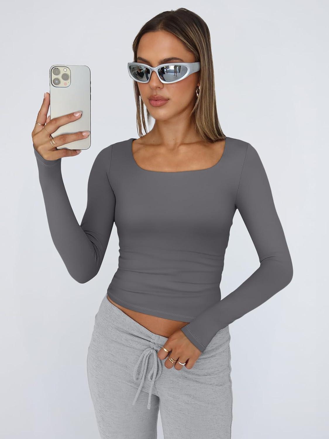 Trendy Queen Womens Long Sleeve Shirts Crop Tops Fall Fashion 2025 Square Neck Going Out Basics Tees Y2k Clothes(Light Gray)