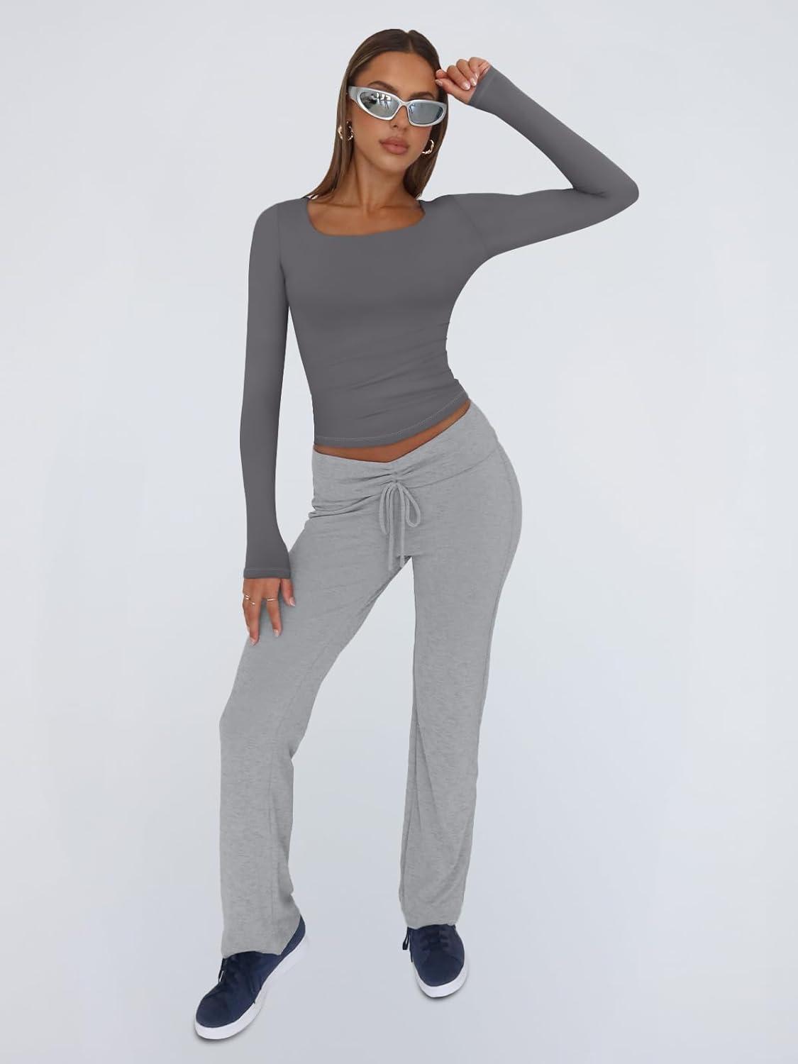 Get the Trendy Queen Womens Long Sleeve Shirts Crop Tops Fall Fashion 2025 Square Neck Going Out Basics Tees Y2k Clothes(Light Gray) you want at a discounted price during our markdown sale event.