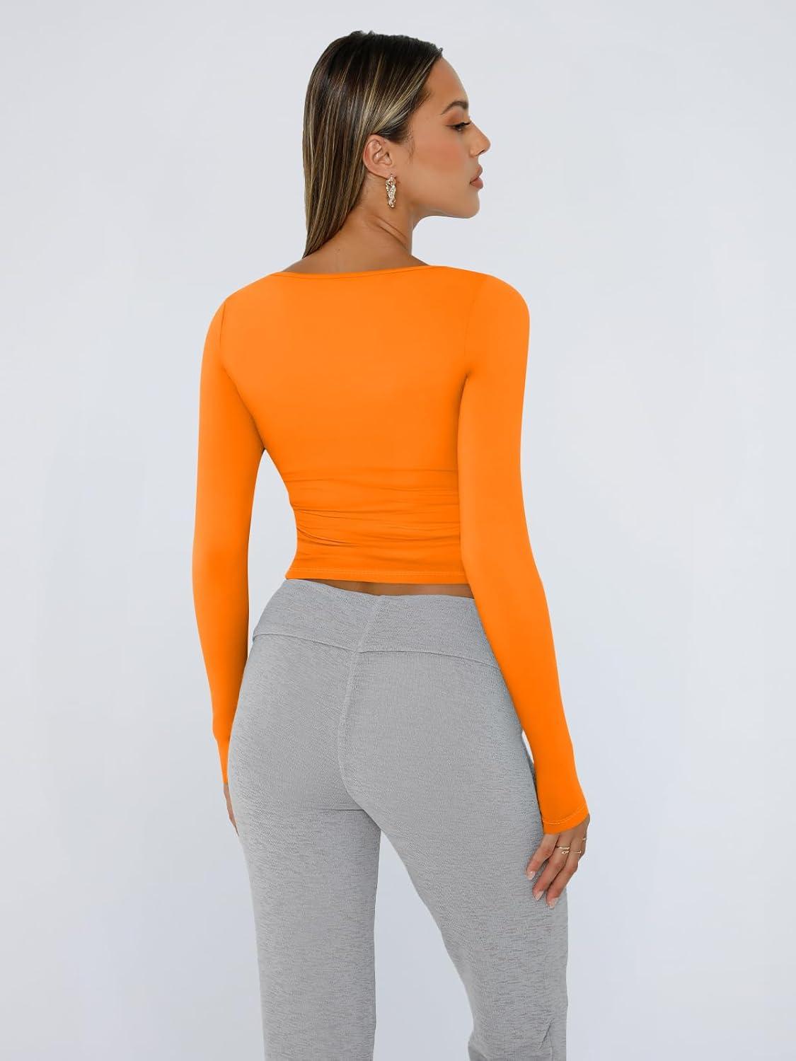 Trendy Queen Womens Long Sleeve Shirts Crop Tops Fall Fashion 2025 Square Neck Going Out Basics Tees Y2k Clothes(Orange)