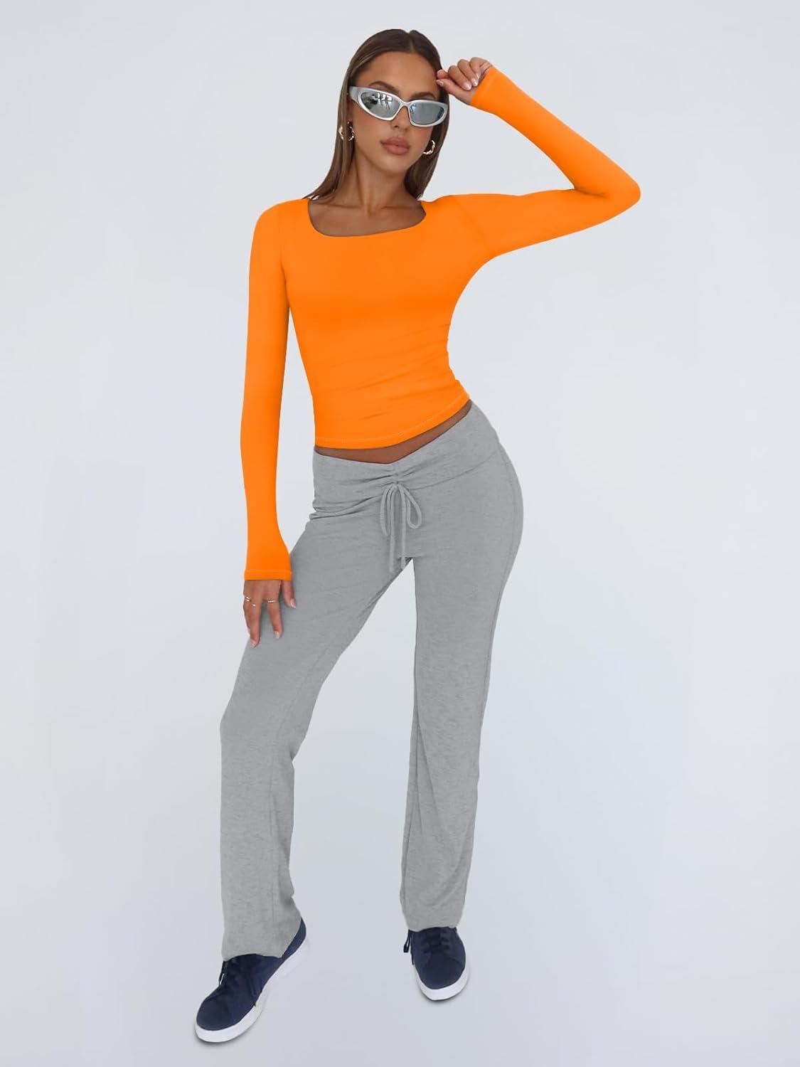 Save big on Trendy Queen Womens Long Sleeve Shirts Crop Tops Fall Fashion 2025 Square Neck Going Out Basics Tees Y2k Clothes(Orange) during our summer blowout sale. Limited quantities available.