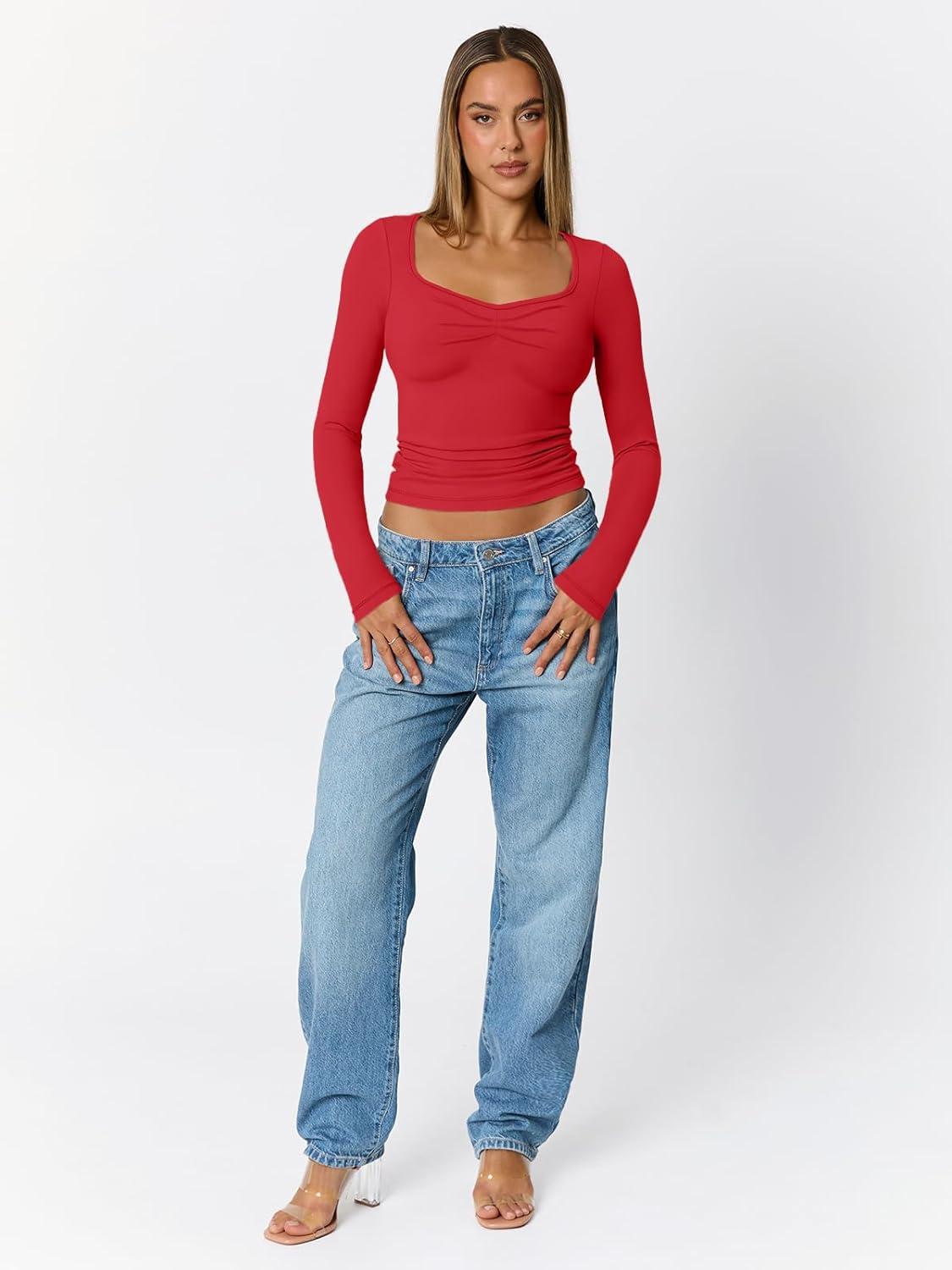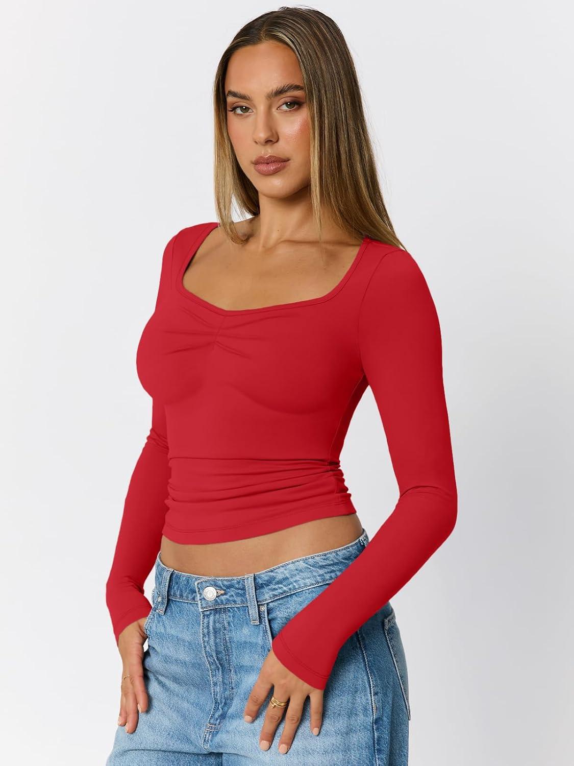 Trendy Queen Womens Long Sleeve Shirts Going Out Crop Tops Sweetheart Neck Workout Tops(Red)