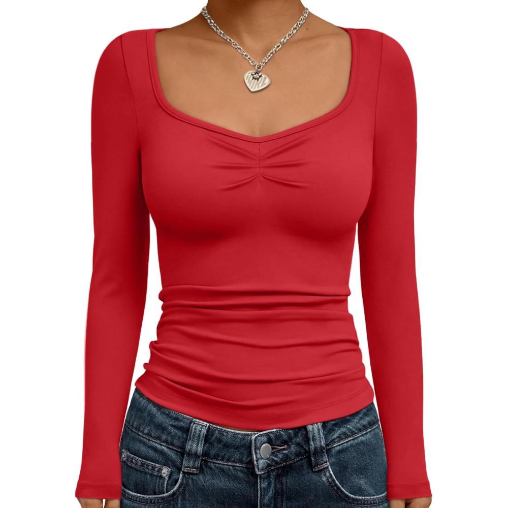 Get up to 50% off on Trendy Queen Womens Long Sleeve Shirts Going Out Crop Tops Sweetheart Neck Workout Tops(Red) styles during our spring sale event.