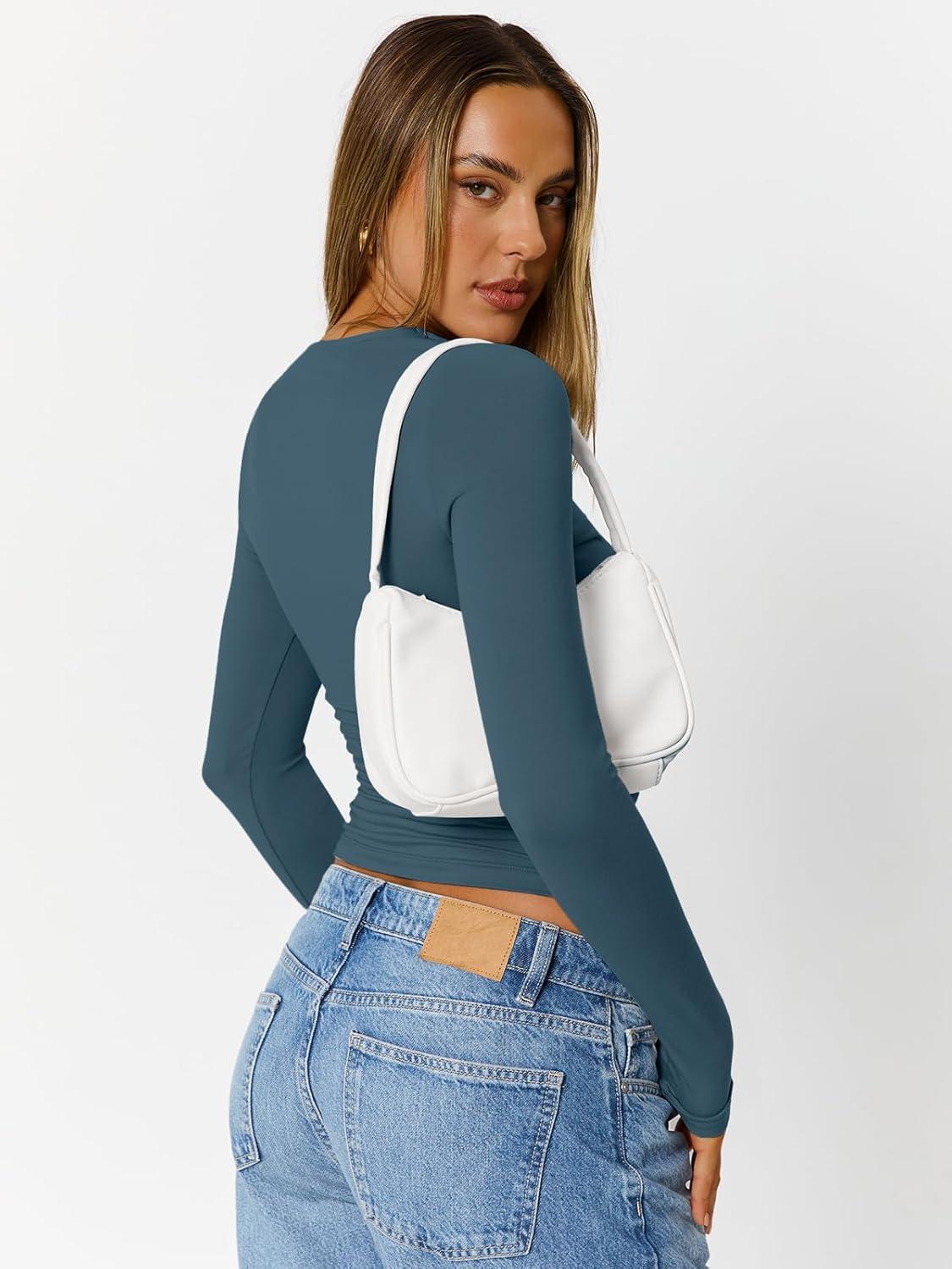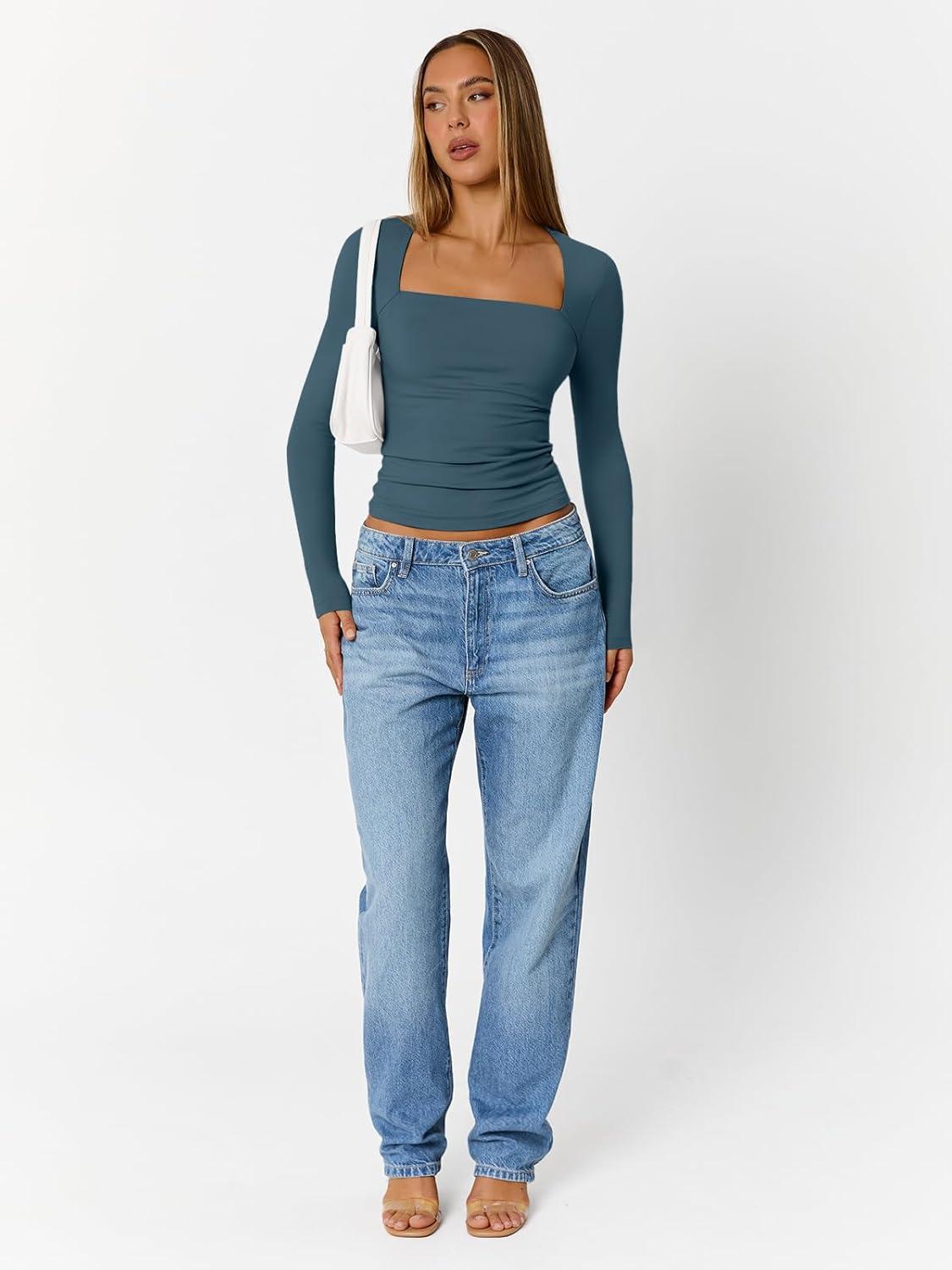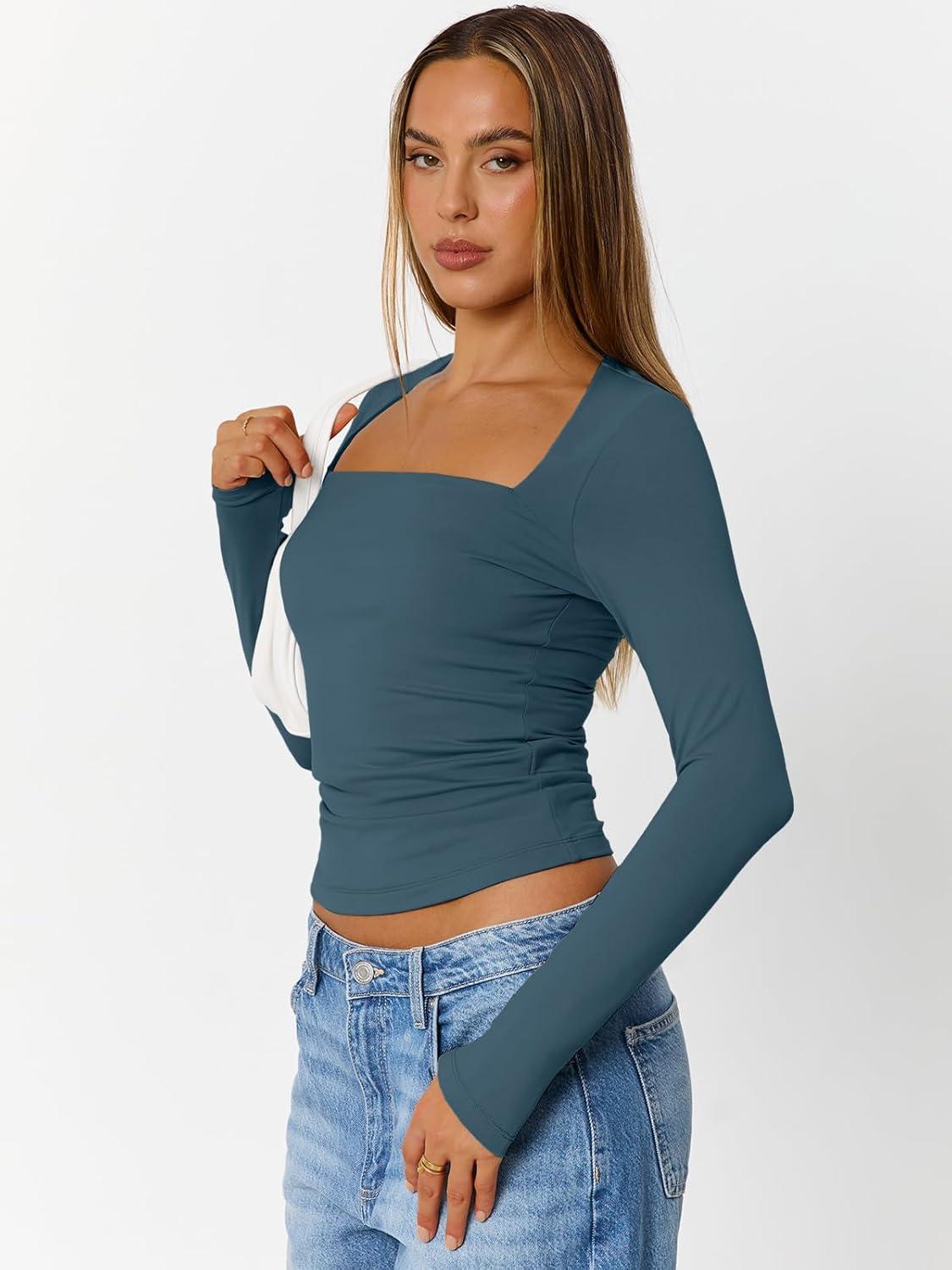 Trendy Queen Womens Long Sleeve Shirts Going Out Tops Square Neck Crop Workout Tops(Hazeblue)