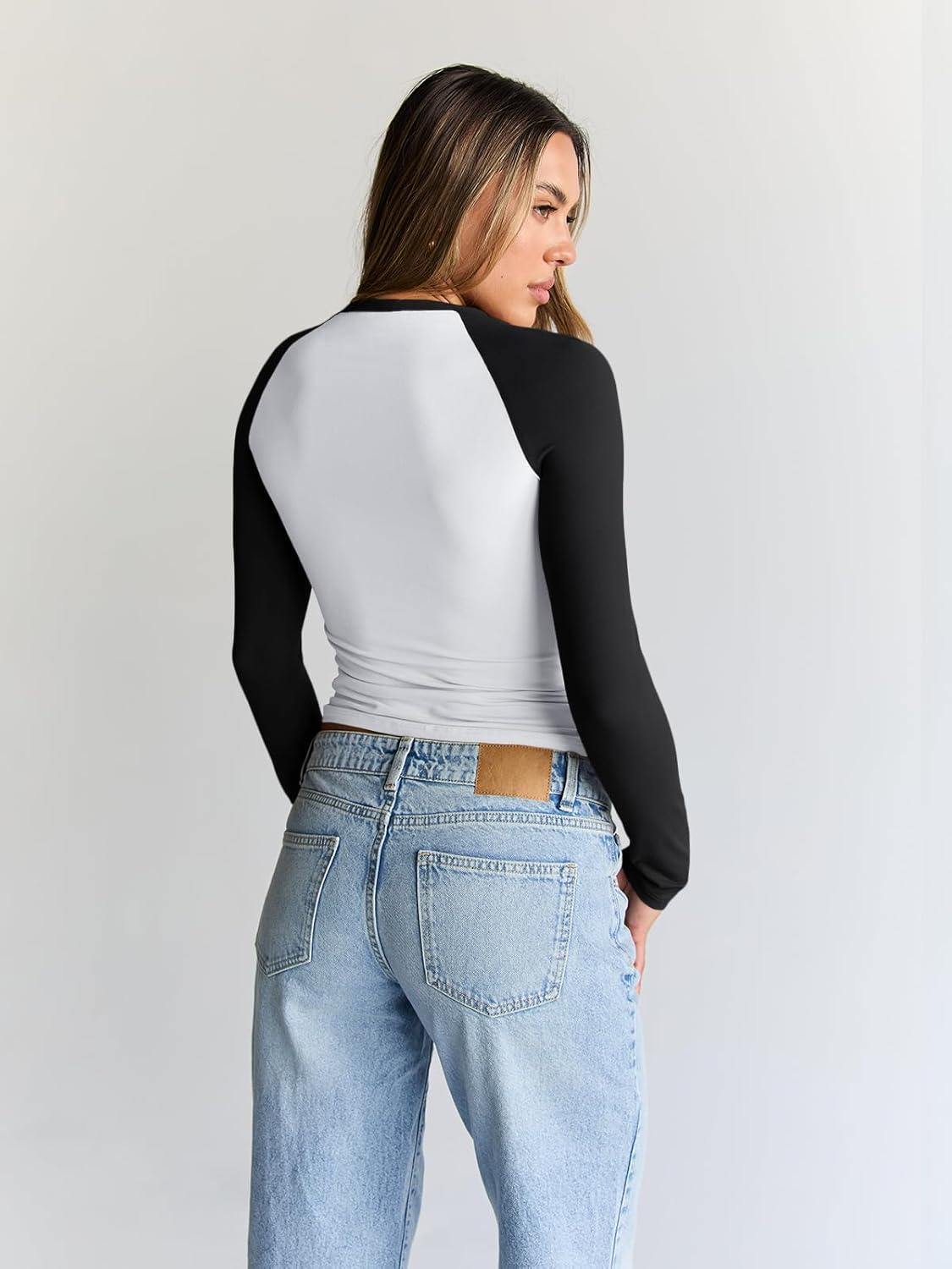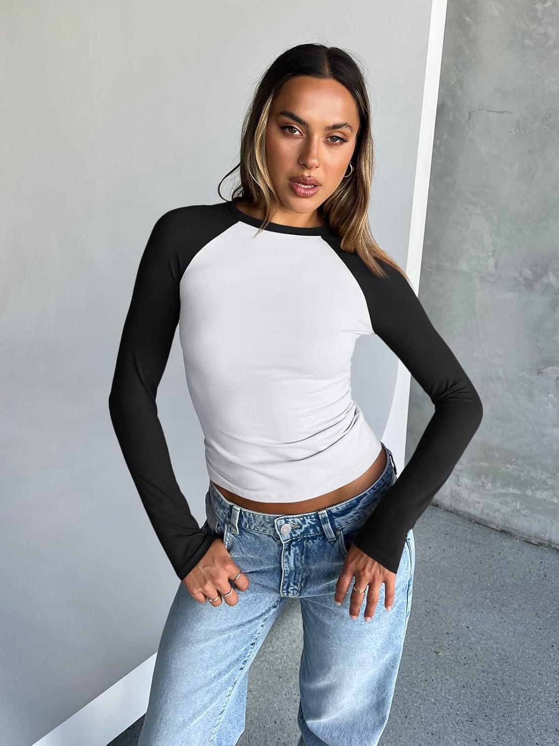 Trendy Queen Women’s Long Sleeve Shirts Slim Fit Stretchy Color Block Slightly Cropped Tops(White Black Combo)