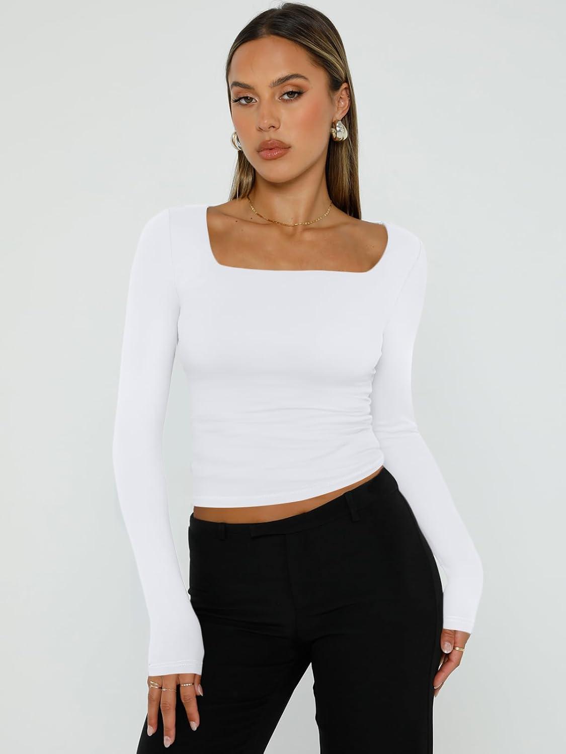 Trendy Queen Womens Long Sleeve Shirts Square Neck Going Out Crop Tops Fashion Y2k Workout Clothes Fall Outfits 2025(White)