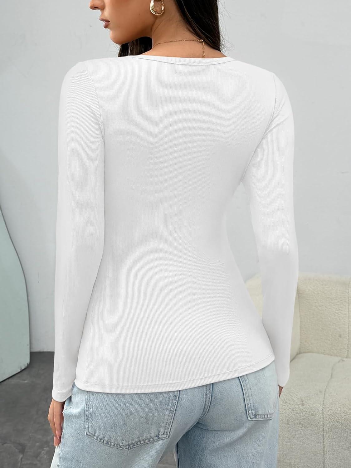Trendy Queen Womens Long Sleeve Shirts V Neck Ribbed Knit Fall Tops(White)