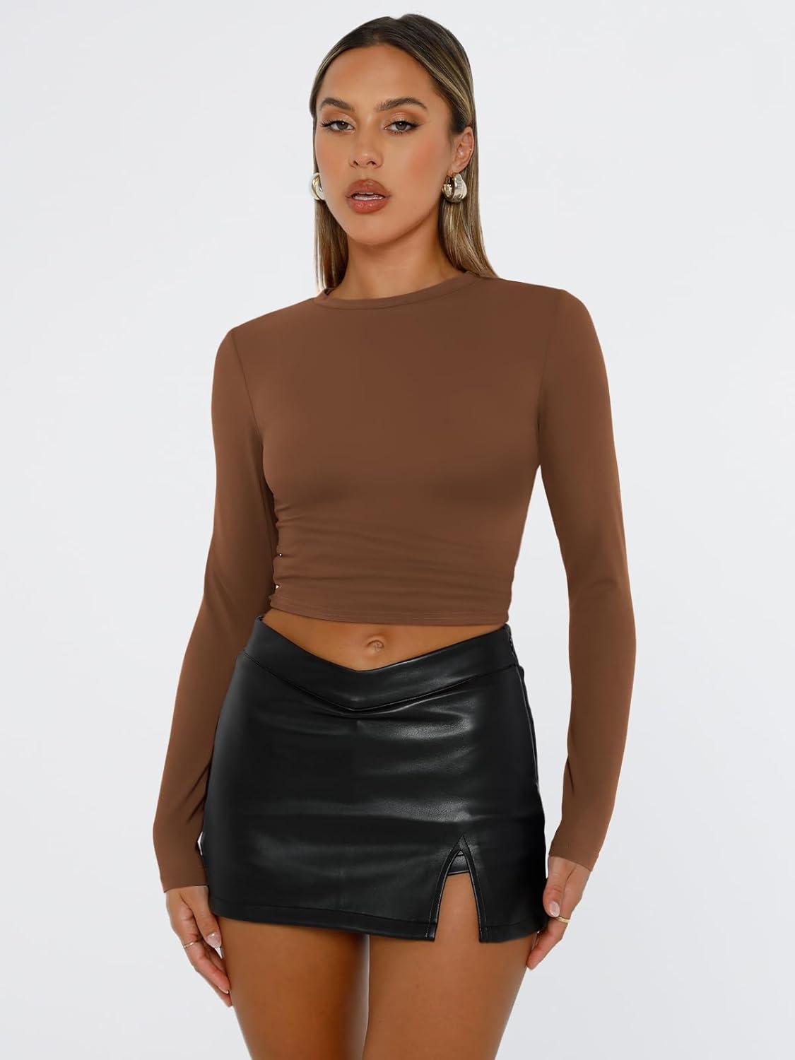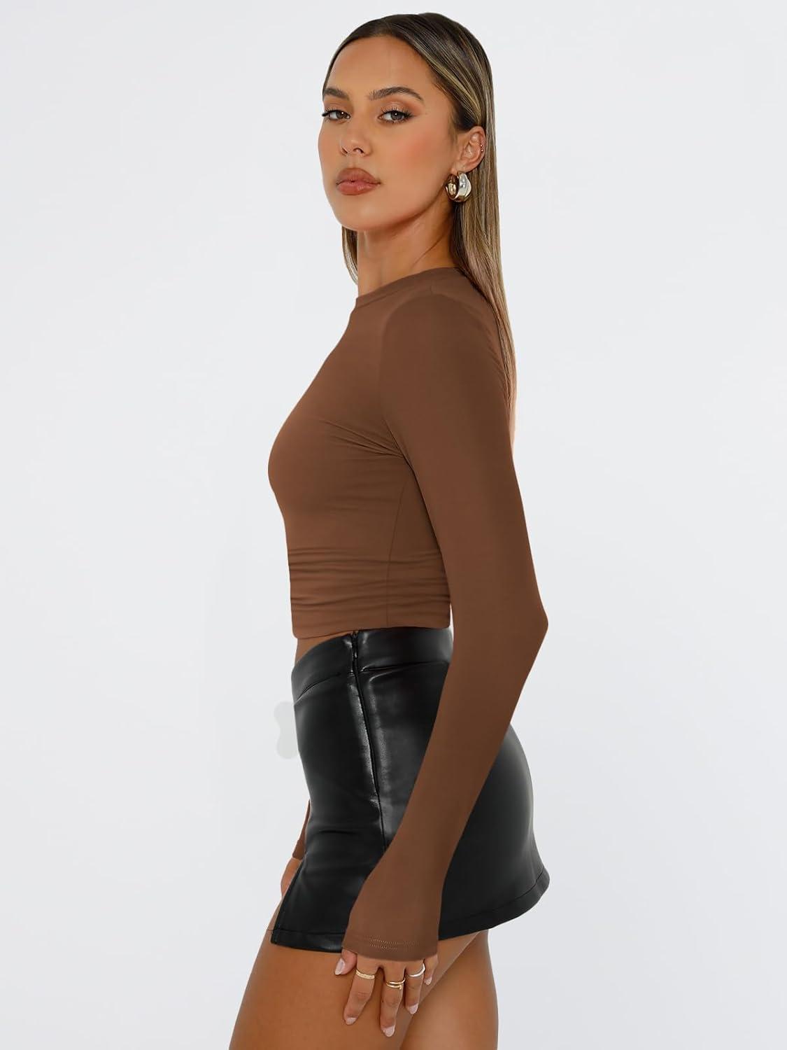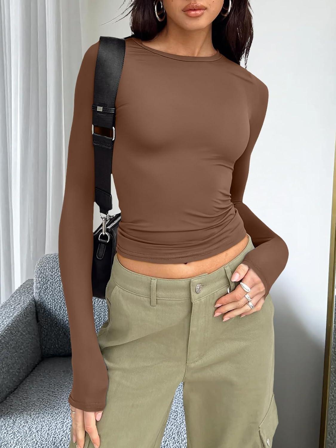Trendy Queen Womens Long Sleeve T Shirts Fall Fashion 2025 Basic Crop Tops Going Out Outfits Y2k Clothes(Chocolate)