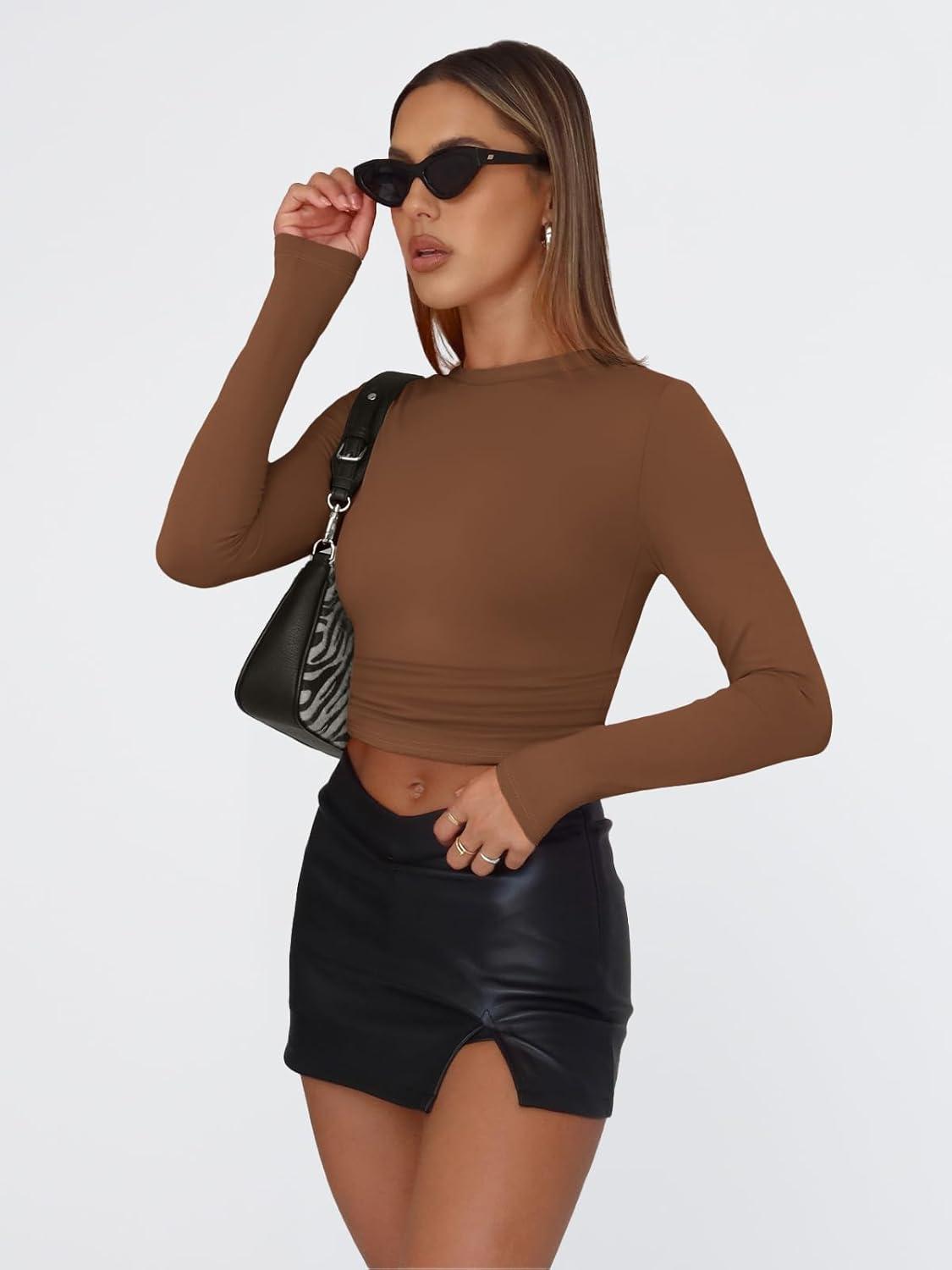 Trendy Queen Womens Long Sleeve T Shirts Fall Fashion 2025 Basic Crop Tops Going Out Outfits Y2k Clothes(Brown)