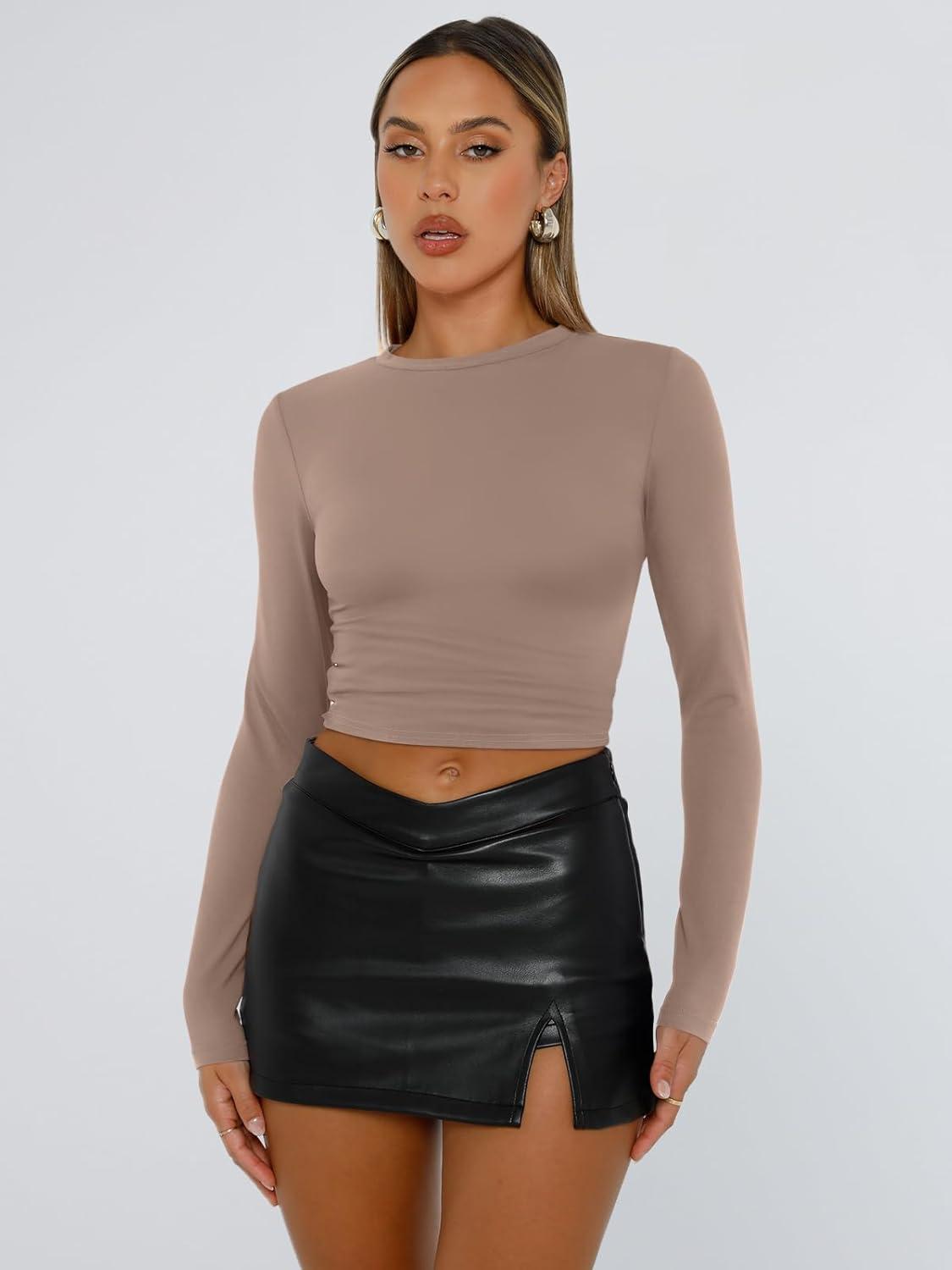 Trendy Queen Womens Long Sleeve T Shirts Fall Fashion 2025 Basic Crop Tops Going Out Outfits Y2k Clothes(Coffee Grey)