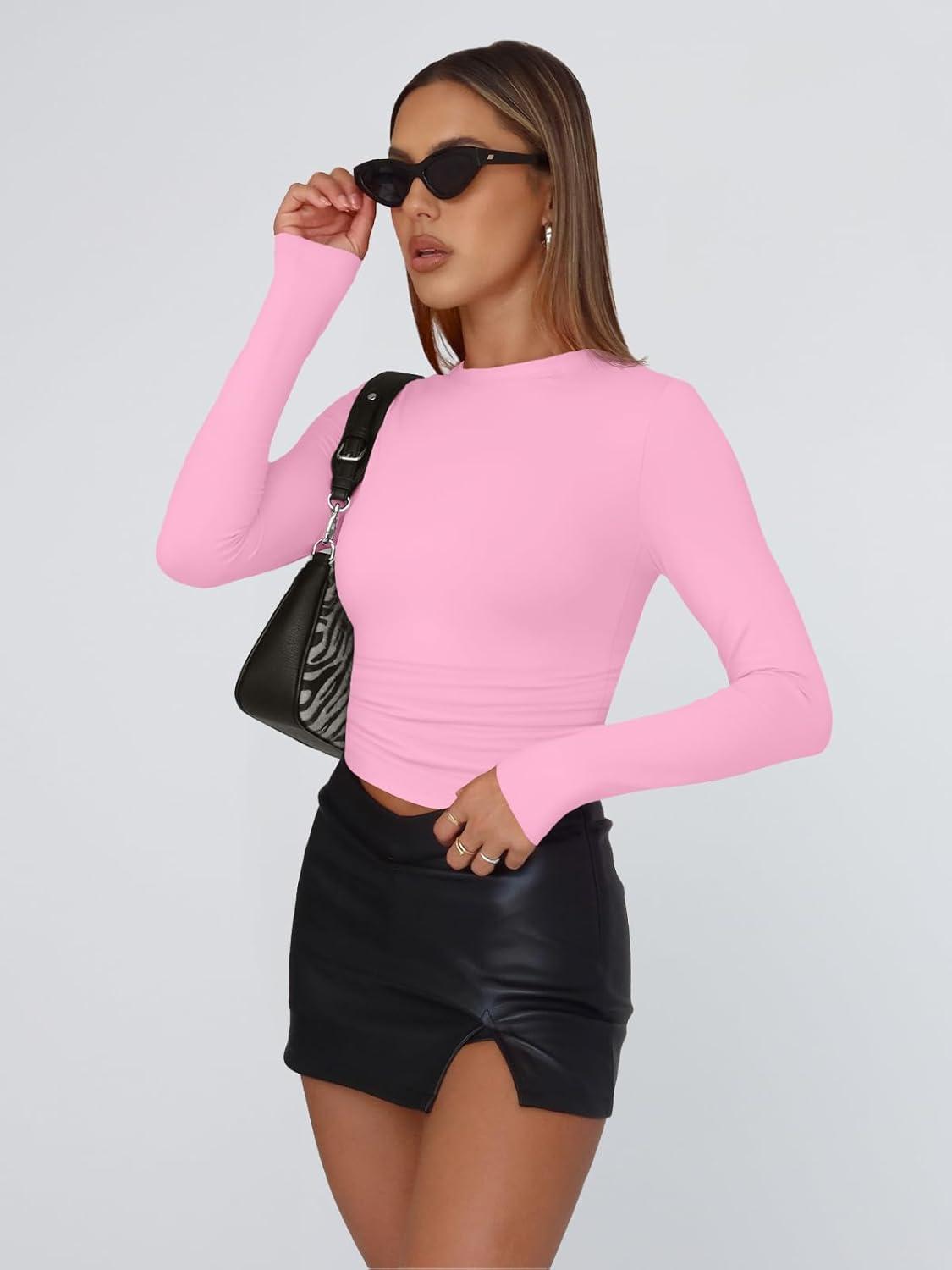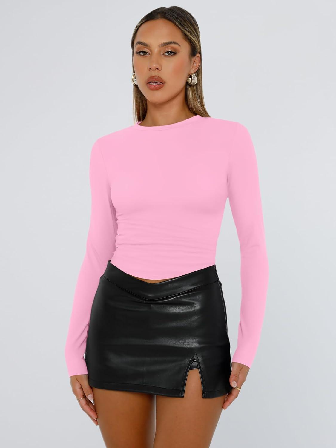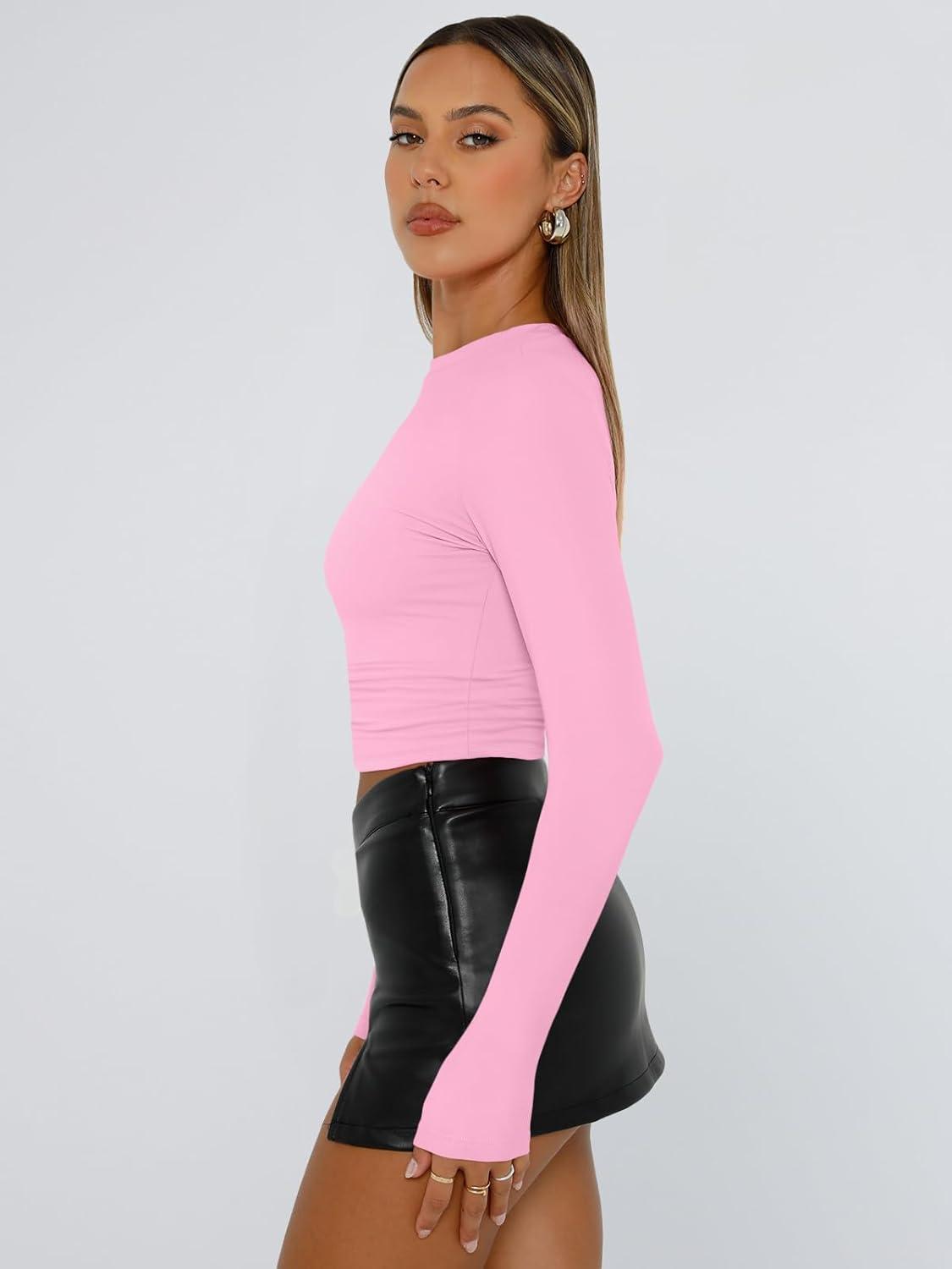 Trendy Queen Womens Long Sleeve T Shirts Fall Fashion 2026 Basic Crop Tops Going Out Outfits Y2k Clothes(Rose Pink)