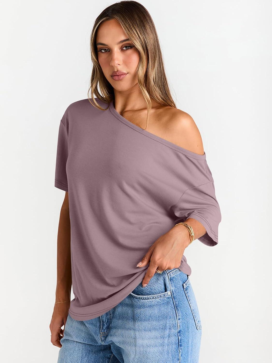 Trendy Queen Womens Off The Shoulder Tops Oversized T-Shirts Short Sleeve Tees Summer 2026 Casual Spring Fashion Clothes(Darkgrey)