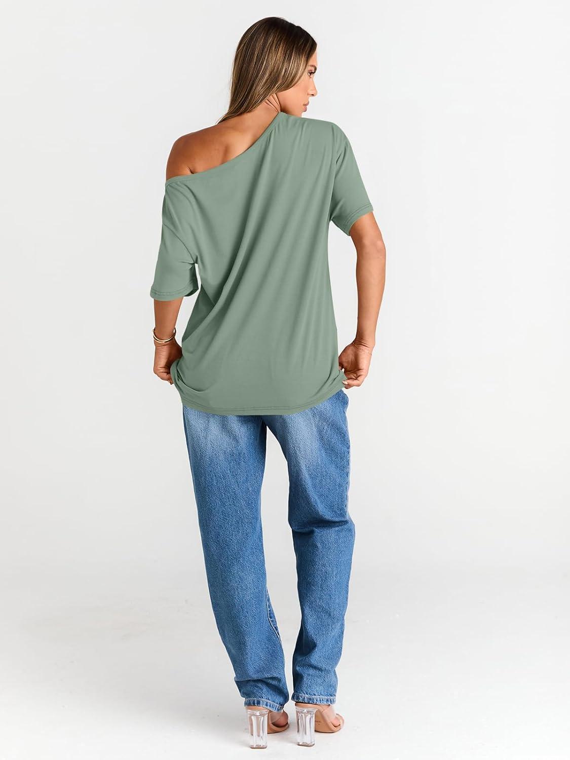 imageTrendy Queen Womens Off The Shoulder Tops Oversized TShirts Short Sleeve Tees Summer 2026 Casual Spring Fashion ClothesGrey Green