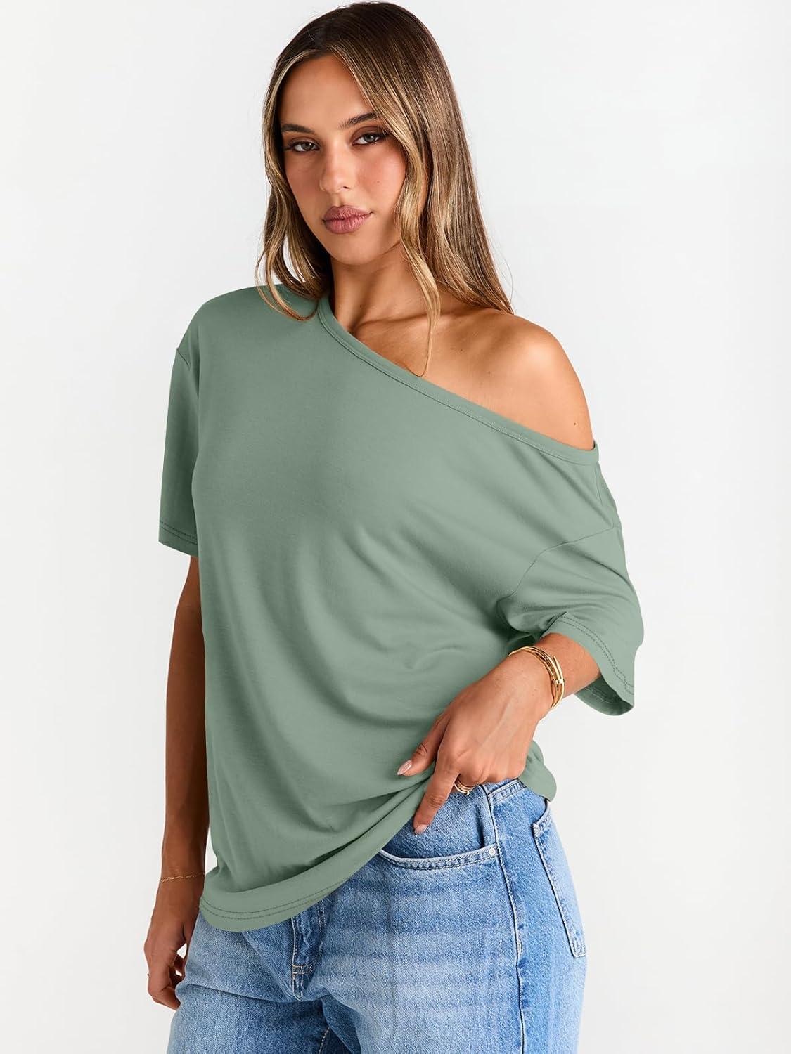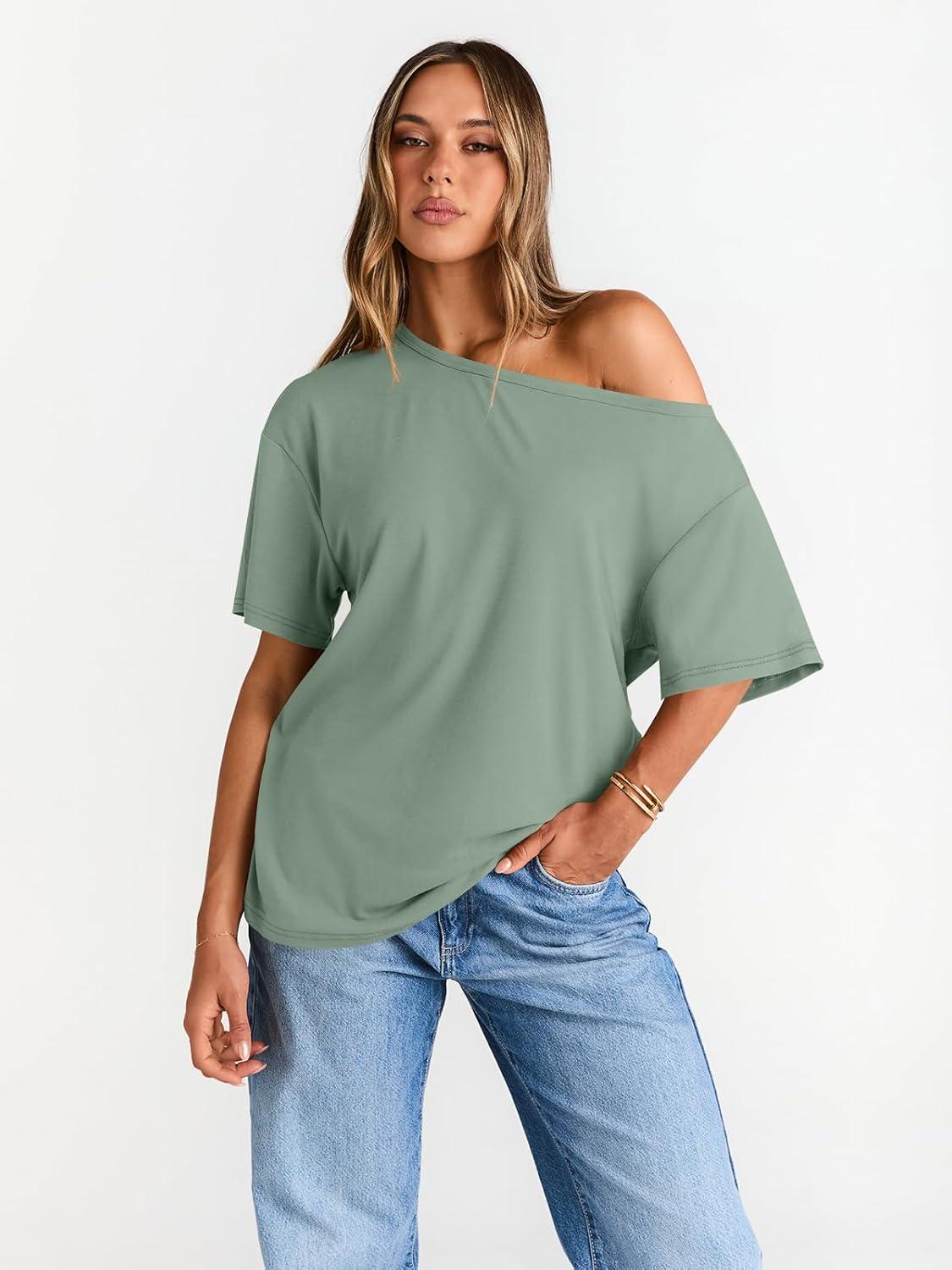 Trendy Queen Womens Off The Shoulder Tops Oversized T-Shirts Short Sleeve Tees Summer 2026 Casual Spring Fashion Clothes(Grey Green)